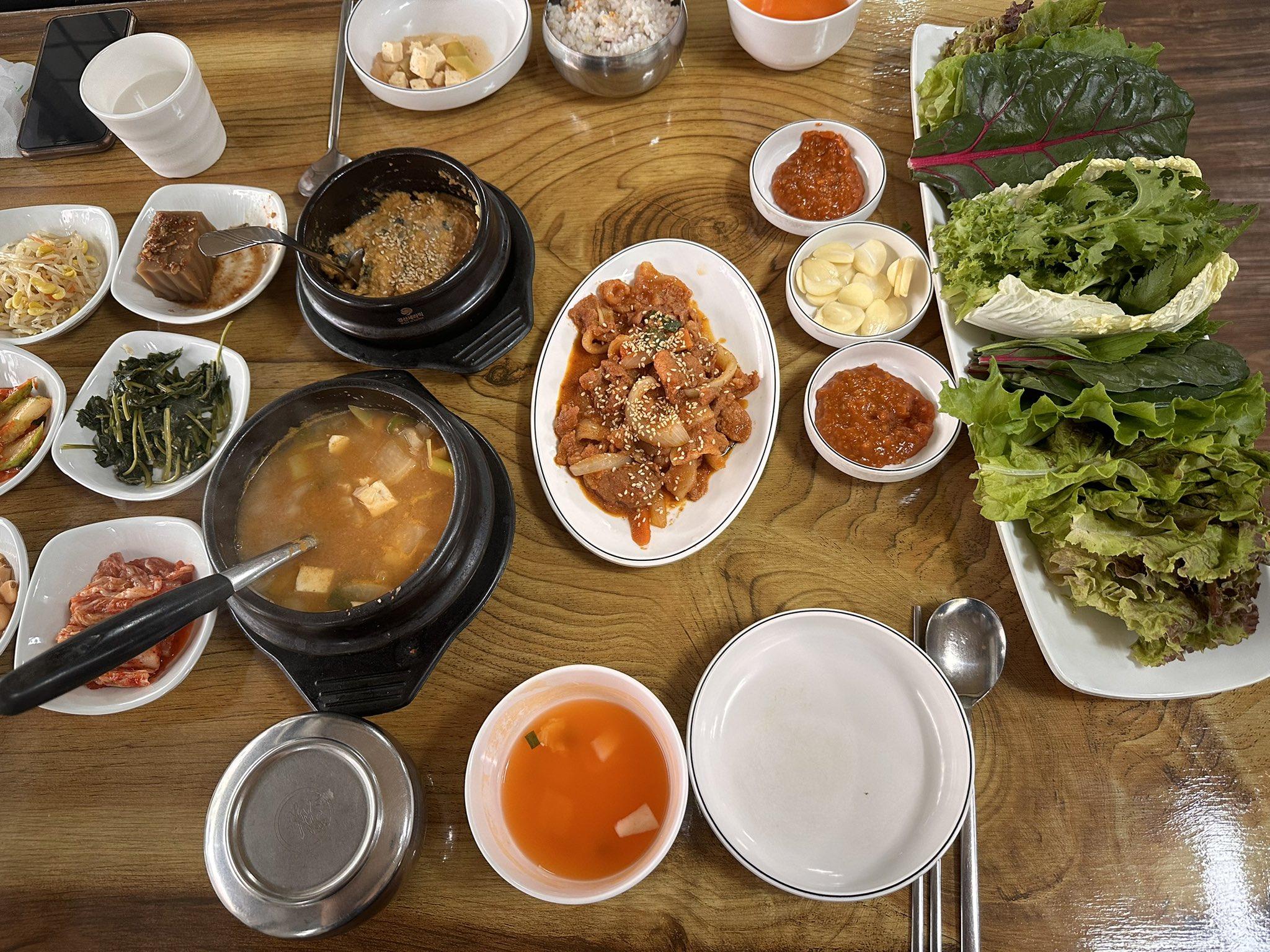 일단 상이 매우 정갈하게 차려지는 데 쌈은 엄청 많이 주시고 나박김치 국물이 엄청 시원하고 각종 나물이 4가지 나오고, 마늘장아찌가나오고, 4가지 쌈장이 나온다: 그리고 두부가 엄청 많이 들어있는 된장찌개는 기본이다.