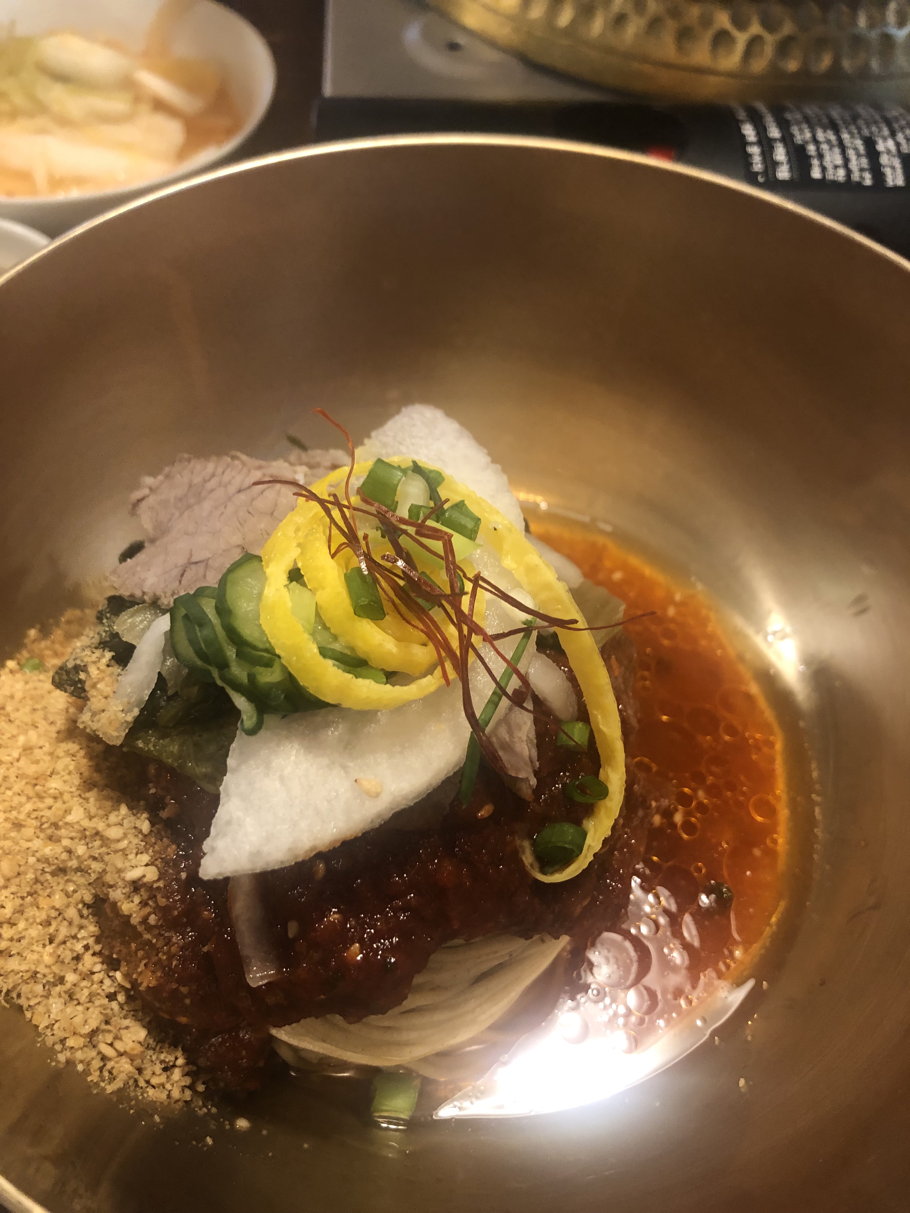 냉면은 일단 기본은 평냉이다. 뚝뚝 끊기는 메밀 맛과 밍밍한 국물의 평냉.. 그냥 비슷하다. 비냉으로는 두가지가 있는데 그냥 비냉이 있고, 들깨를 많이 넣어주는 비냉이 있다. 우리는 들깨가 많이 들어간 비냉과 물냉하나를 시켰다. 그런데 들깨 비냉은 그냥 그렇다. 물냉이 낫긴 낫다