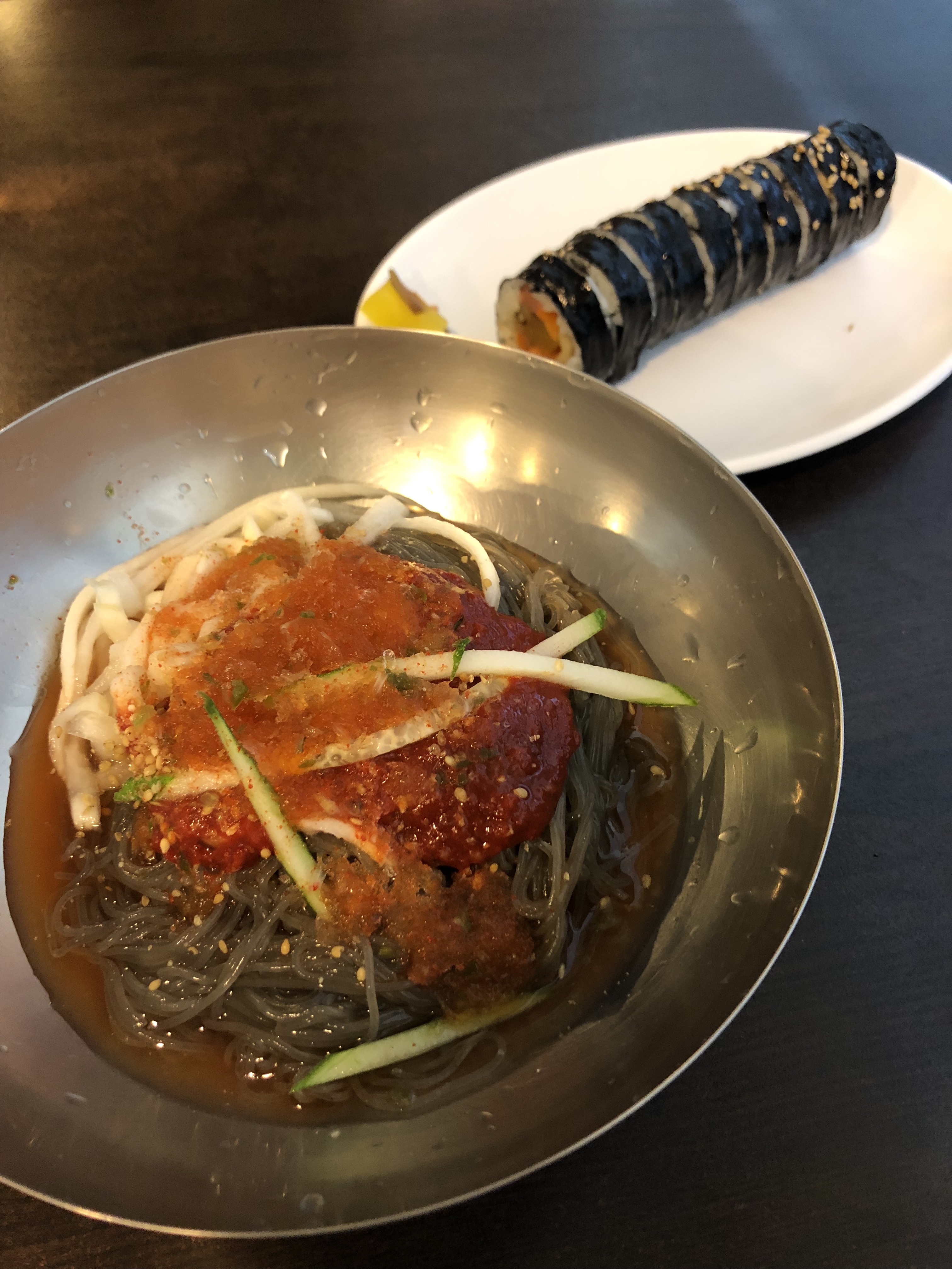 사람들이 가장 많이 주문한다는 원조냉면은 매운맛/보통맛/하얀맛이 있는데 이게 일종의 물냉면인데 3500원.. 대부분 이걸 시키는데 보니까 국물이 뻘겋다. 이럴거면 그냥 비빔 냉면을 시키는게 낫겠다 싶어서 비냉을 시켰는데 이건 참기름에 무 고명 조금 얹어져 있고 4000원이다. 노 의원이 김밥을 같이 시켜 먹었다길래 나도 1,500원짜리 김밥도 같이 시켰다.