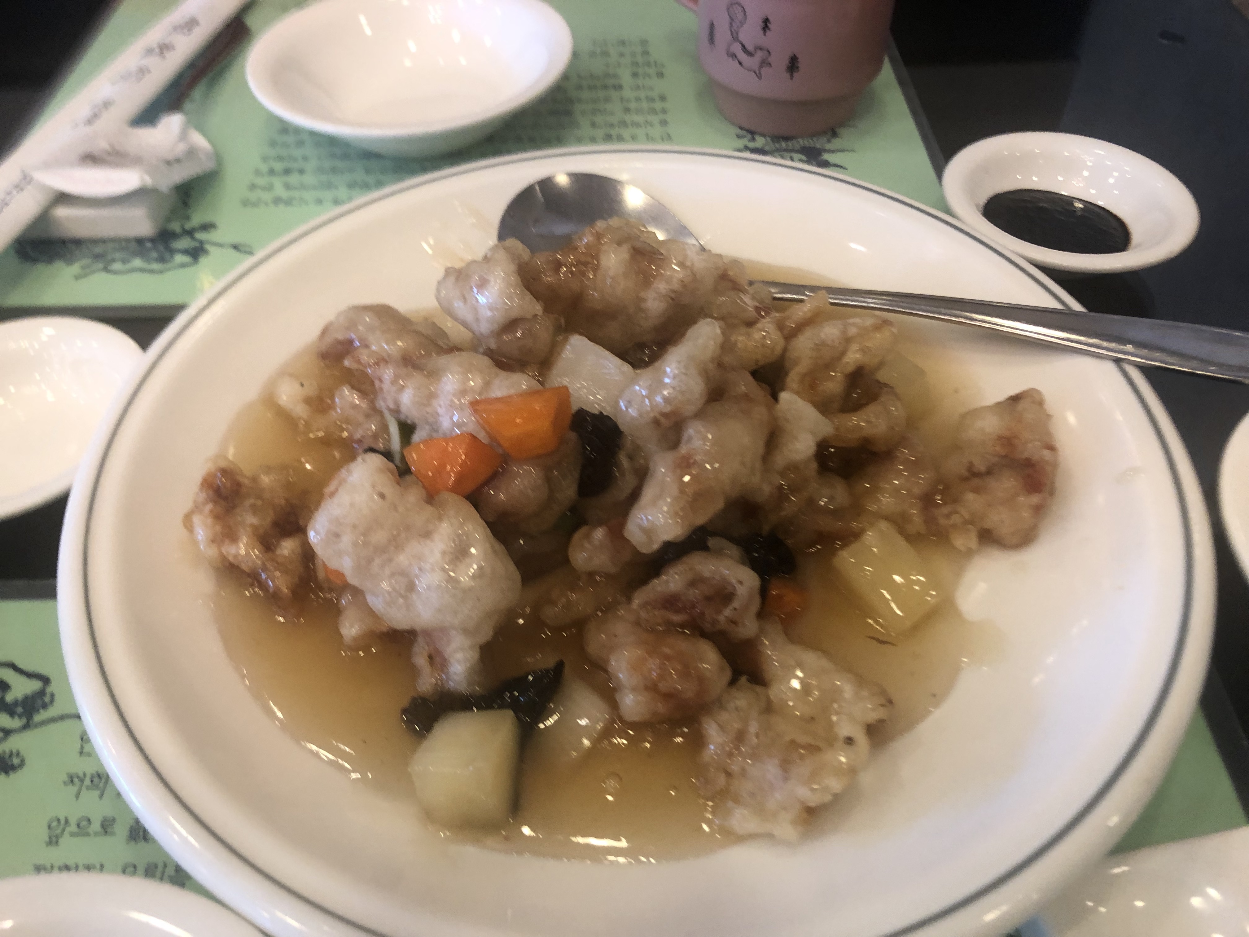 아무튼 탕수육 소스의 뽀얗고 투명한 느낌과 달달함과 바삭함, 이 정도면 90점이다. 그치만 가격은 너무 한심하다. 돼지고기 튀긴 이 양에 2만 4천원. 너무 심하지 않냐? 아무리 압구정 임대료 문제라고 해도 말이다. 하지만 다음에도 생각나는 맛일 것 같긴하다.