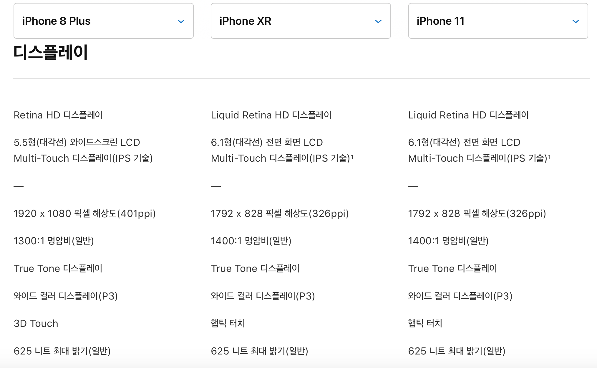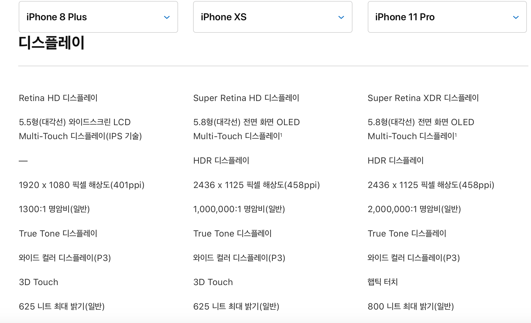 참고로 아이폰 8플러스 디스플레이, 아이폰 XS, 그리고 이를 업그레이드한 아이폰 11프로는 이렇게 비교가 된다.