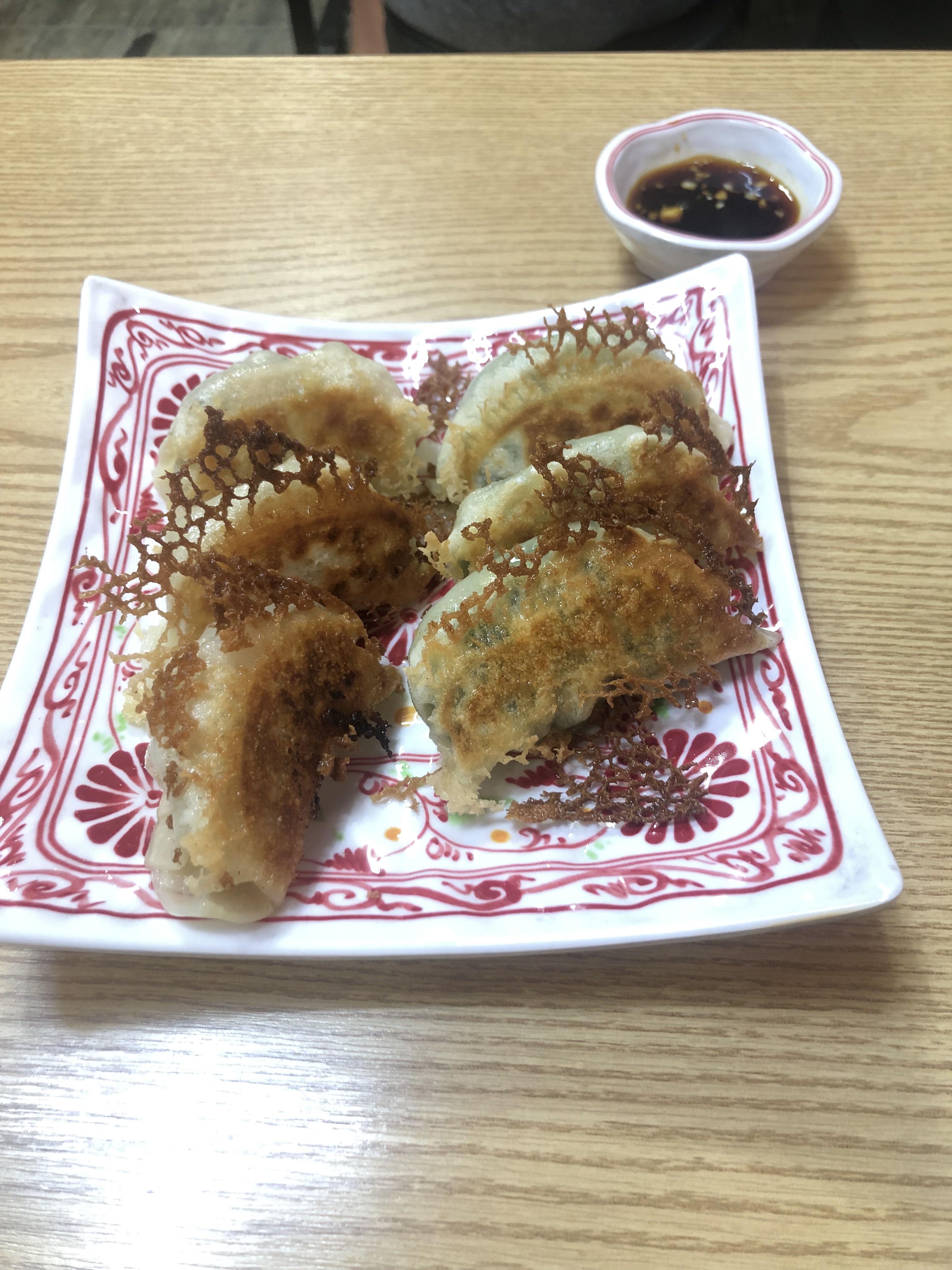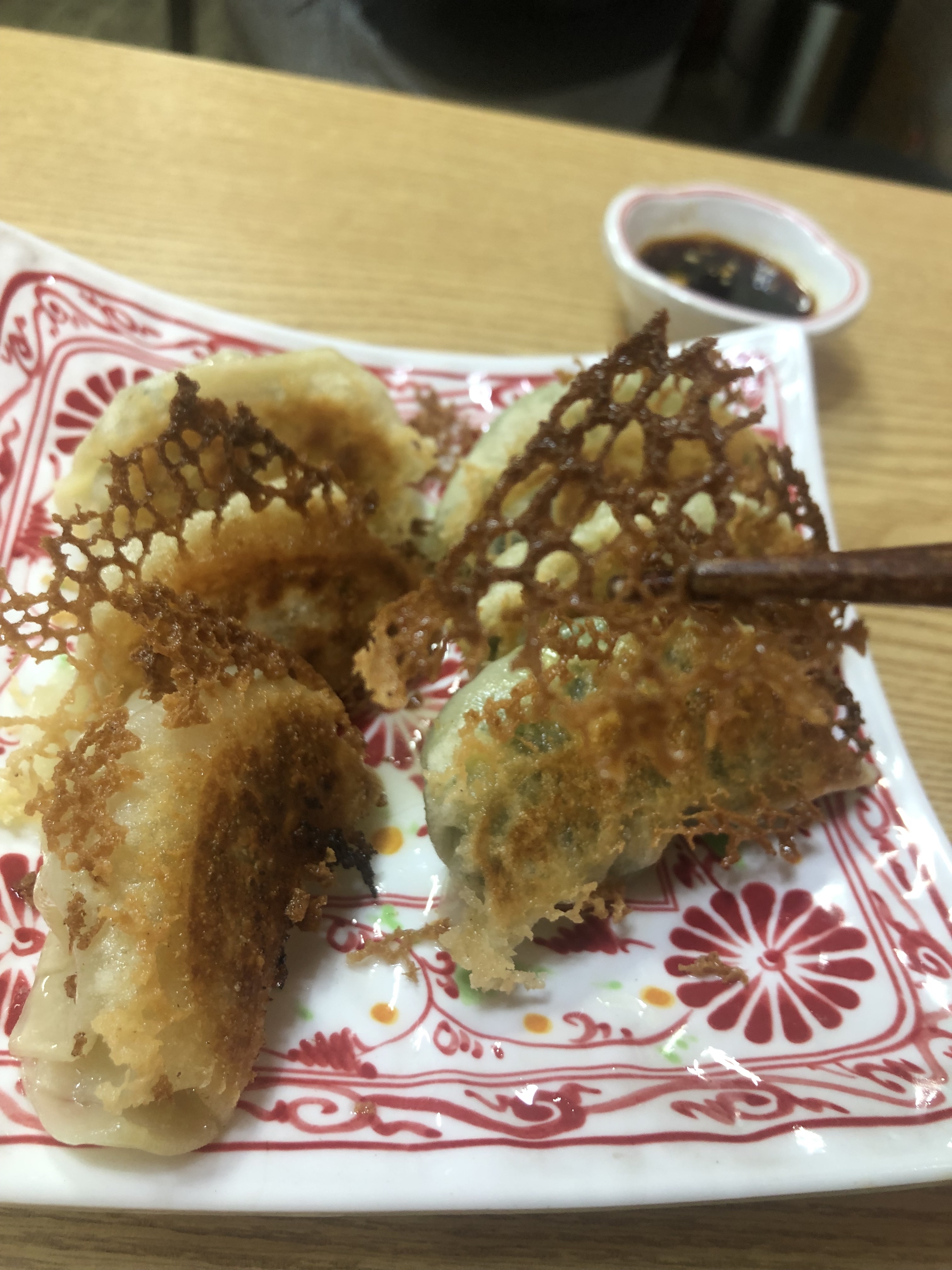 여섯개가 나옵니다. 그물 모양인 것이 만두가 구워질 때 그 만두피 부분이 저렇게 된 것입니다. 바삭하고 맛잇습니다.