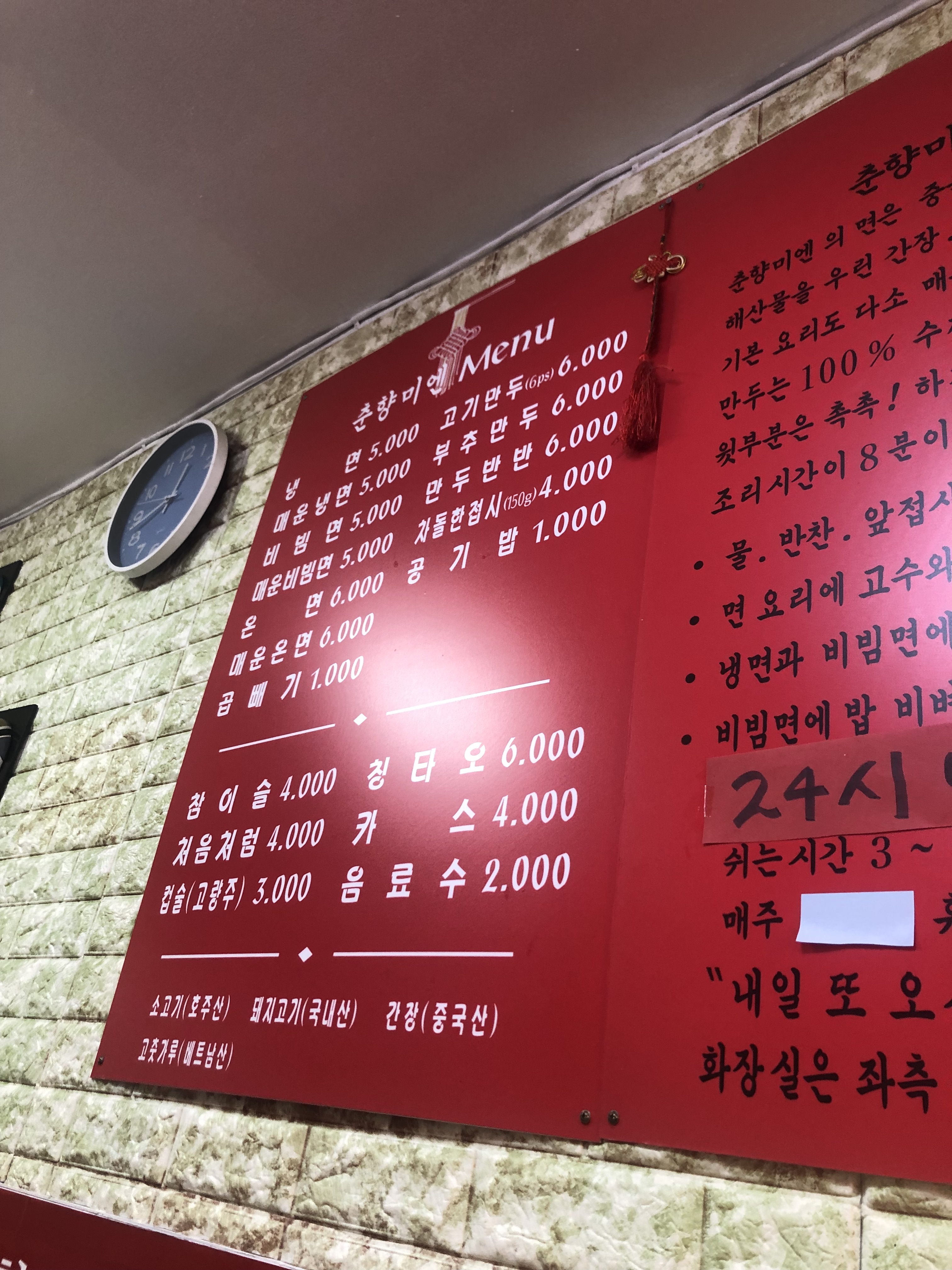 매뉴판은 벽에 있습니다. 메뉴가 모두 6천원 이하입니다. 놀랍지 않나요? 물과 반찬은 셀프입니다.