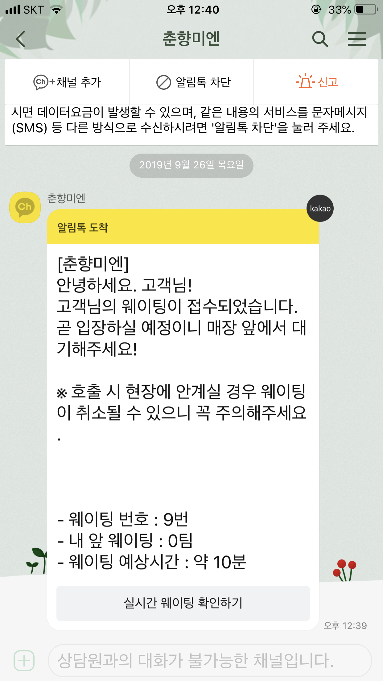 왕십리 행당시장에 있는 춘향미엔을 다녀왔습니다. 중국집도 아니고 베트남식도 아닌 국수를 파는 곳인데, 사실 정말 맛있는 만두를 파는 곳입니다. 대기가 항상 있습니다. 특히 점심시간이나 저녁시간에 가면 더 그렇죠. 다행이 대기는 카톡으로 웨이팅 번호를 알려줍니다. 생각보다 오늘은 대기가 짧아서 바로 들어갔습니다. 10분이라고 했지만 바로 자리가 났어요 보시다시ㅍ 12시 40분쯤 이었구요.