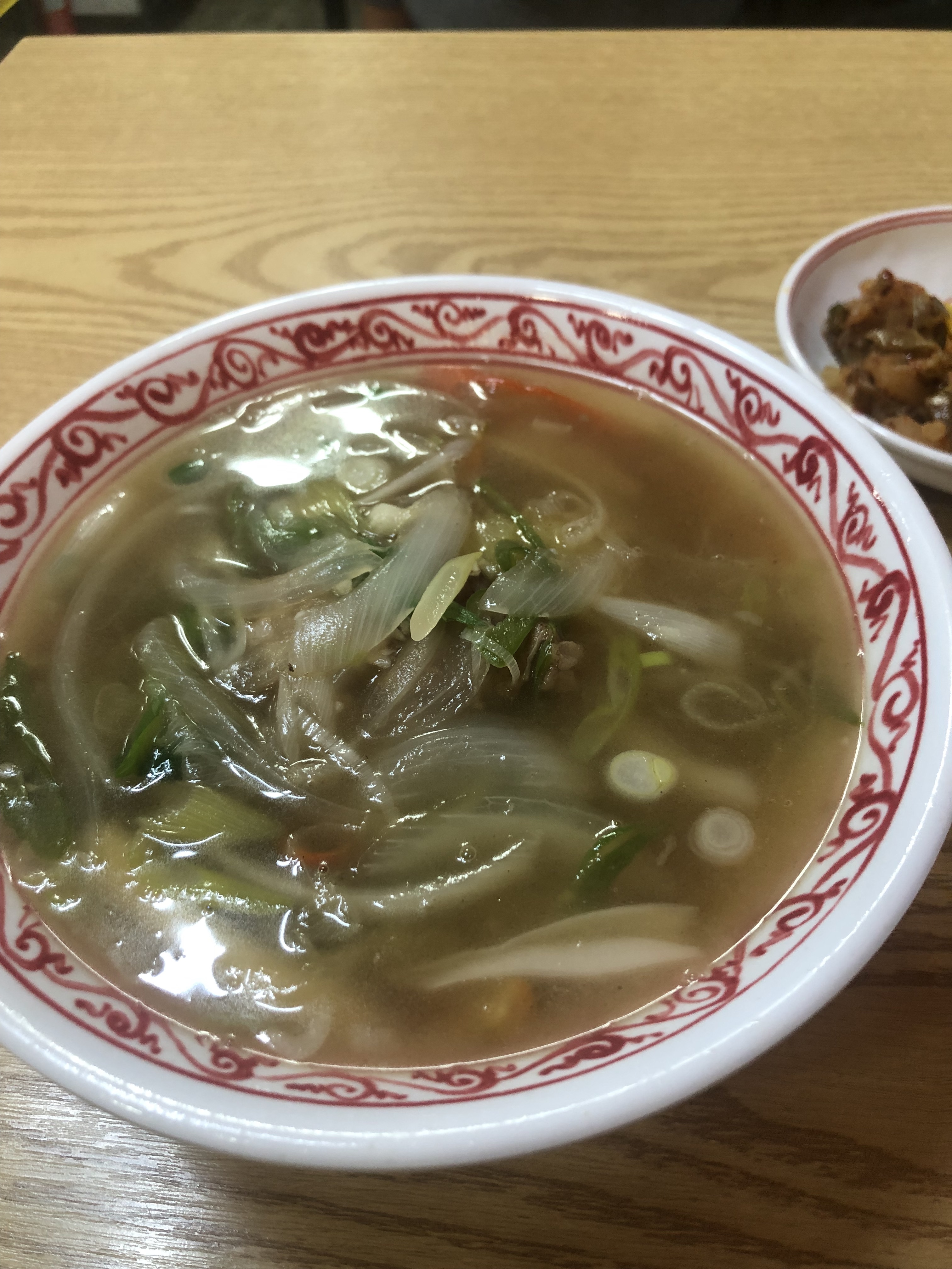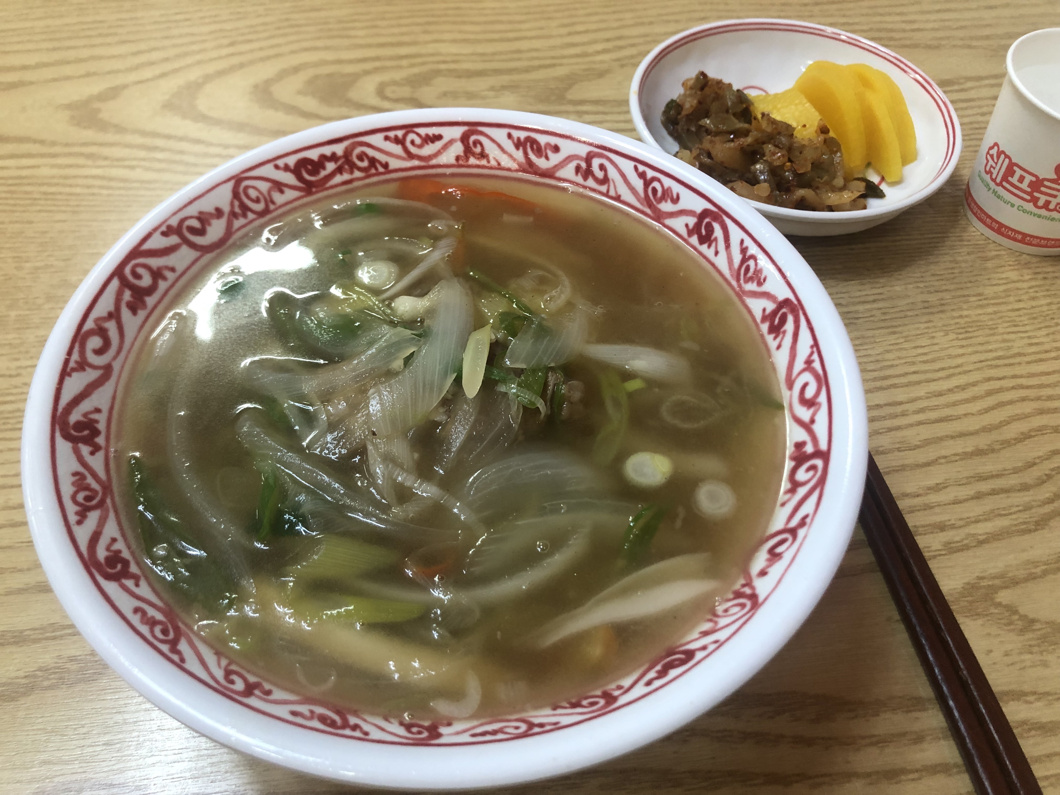 국물은 첫 느낌은 소고기무우국과 비슷합니다. 그 보다 약간 기름기가 더 많다고 생각하면 맞을 듯 하네요. 소고기뭇국같은 그런 깔끔함이 아니고요. 그래도 느끼하지 않은 것은 국물맛 때문입니다. 아 일단 면은 옥수수면이라 부드럽습니다. 그런데 국물맛이 칼칼하고 좋습니다. 겨우 6천원인데말이죠. 베트남 쌀국수와 빛깔은 비슷한데 맛은 완전히 다른 새로운 맛입니다. 매콤하고 칼칼함은 나가사끼 짬뽕하고도 좀 비슷한데 그것도 아니고요. 아무튼 맛잇습니다. 다음엔 냉면을 시켜봐야겠습니다.