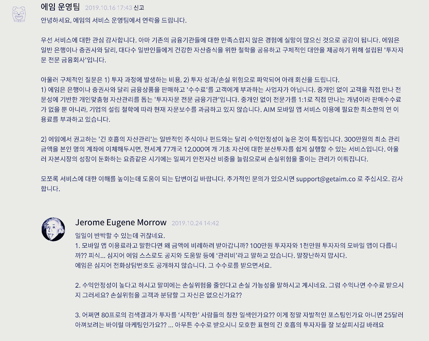 이 글을 쓰고 나서 AIM 운영팀에서 이 글을 찾아와 직접 저 아래 댓글을 남겼다. 좀 어이가 없어서. 내가 다시 댓글을 남겼는데, 아무런 말이 없다. 아마도 팩폭에 놀라서 ..? 에임에서 혹시 글을 지울지 몰라서.. 이미지 형태로 여기 다시 첨부한다.