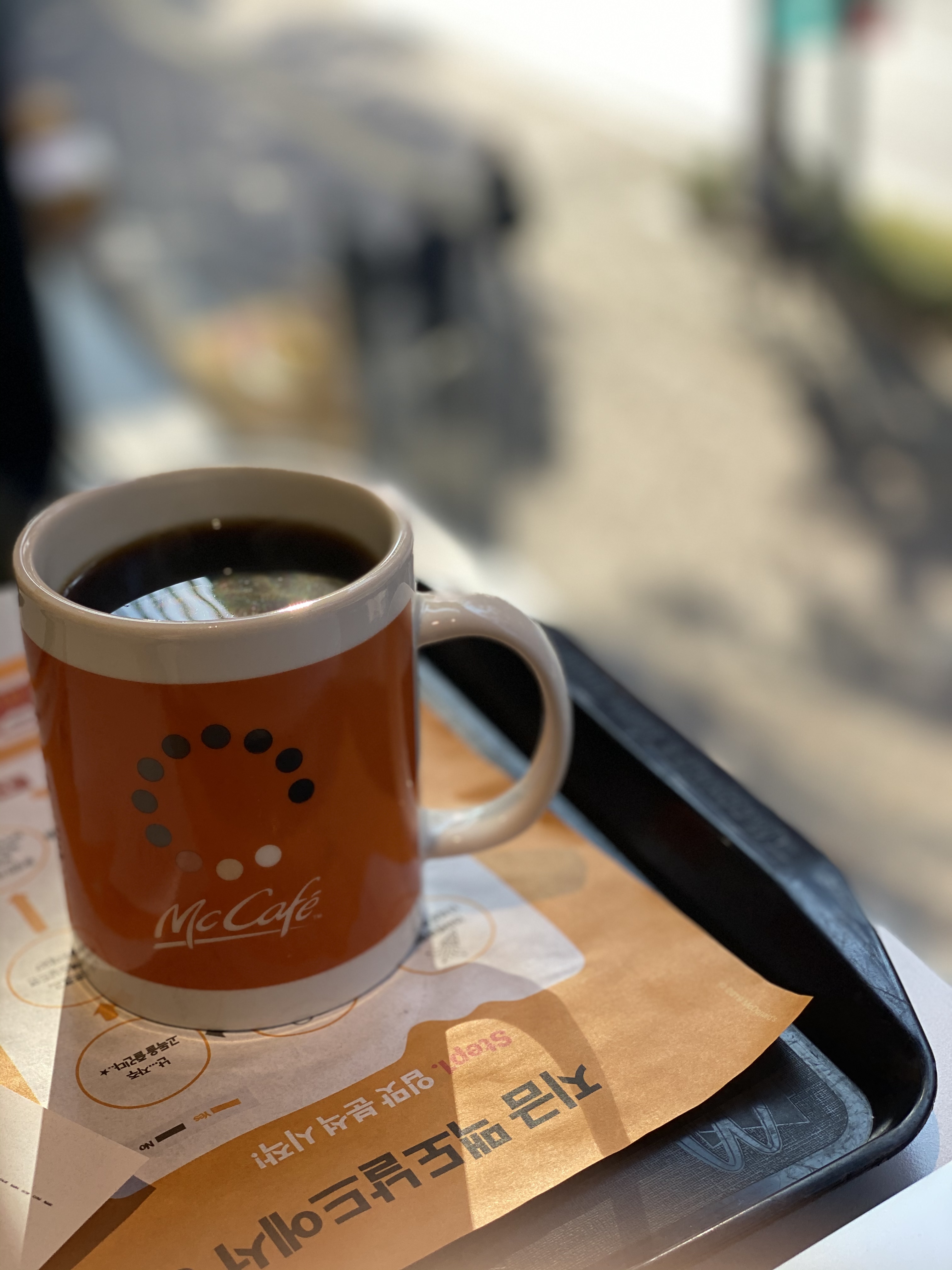 잠시 후 맥도날드 점원이 주문한 커피를 가져다 주시네요. 아마 진동벨 그 동그란거에 매장내 위치를 식별할 수 있는 비콘같은게 들어있나 봅니다. 결국 편리하게 자리에 앉아서 기다려서 커피를 받을 수 있었습니다.