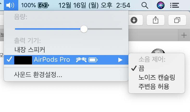 어쨌거나 결론을 말하면 이럴때는 맥북의 표시줄을 확인하면 된다. 블루투스에 연결돈 에어팟프로의 메뉴 말고 스피커 메뉴에서 확인해야 한다. 연결 이후에 스피커 메뉴에 출력되고 있는 에어펏 프로가 보이고, 거기에서 노이즈캔슬링 모드의 조절이 가능한 것을 확인할 수 있다.