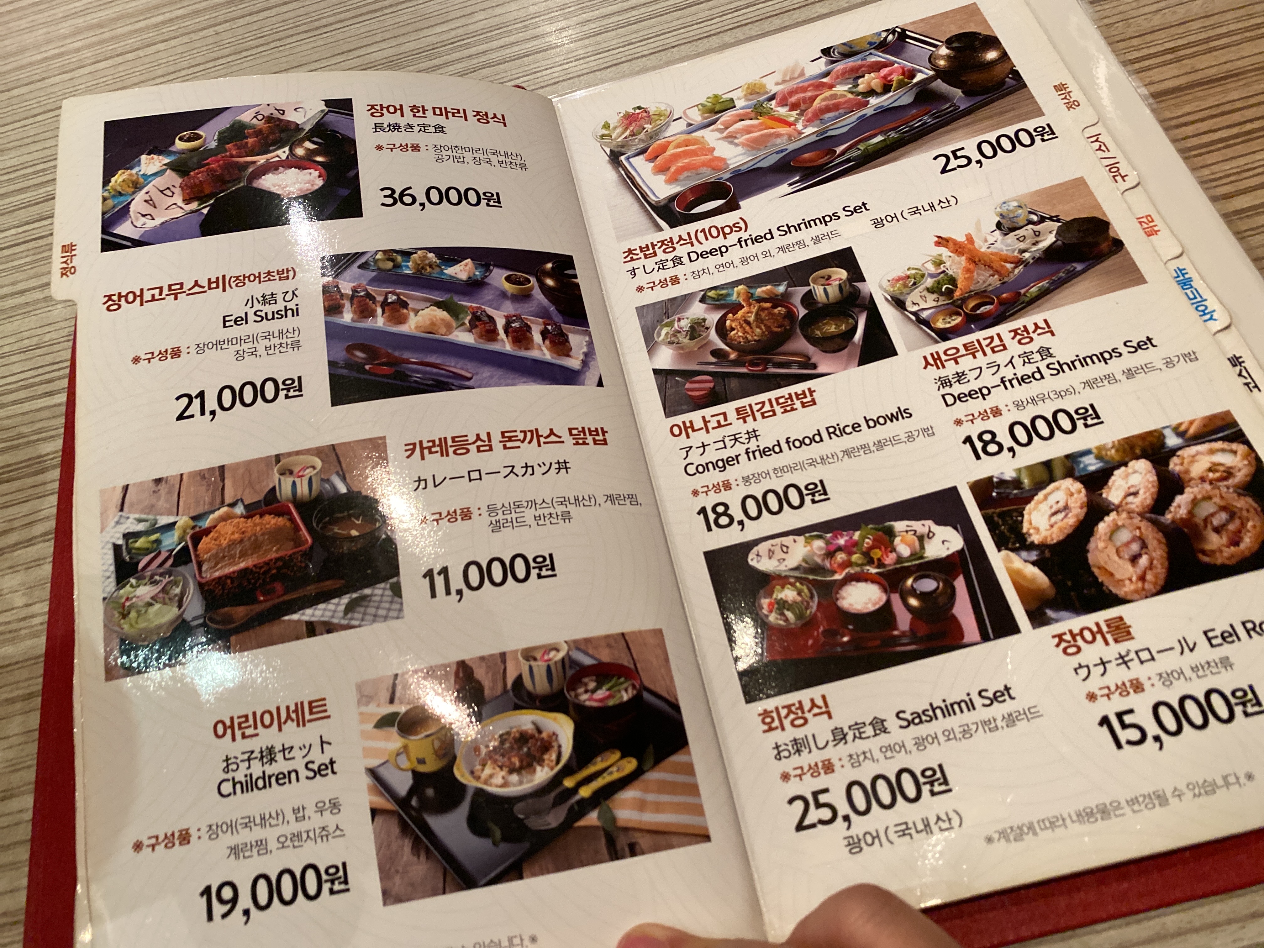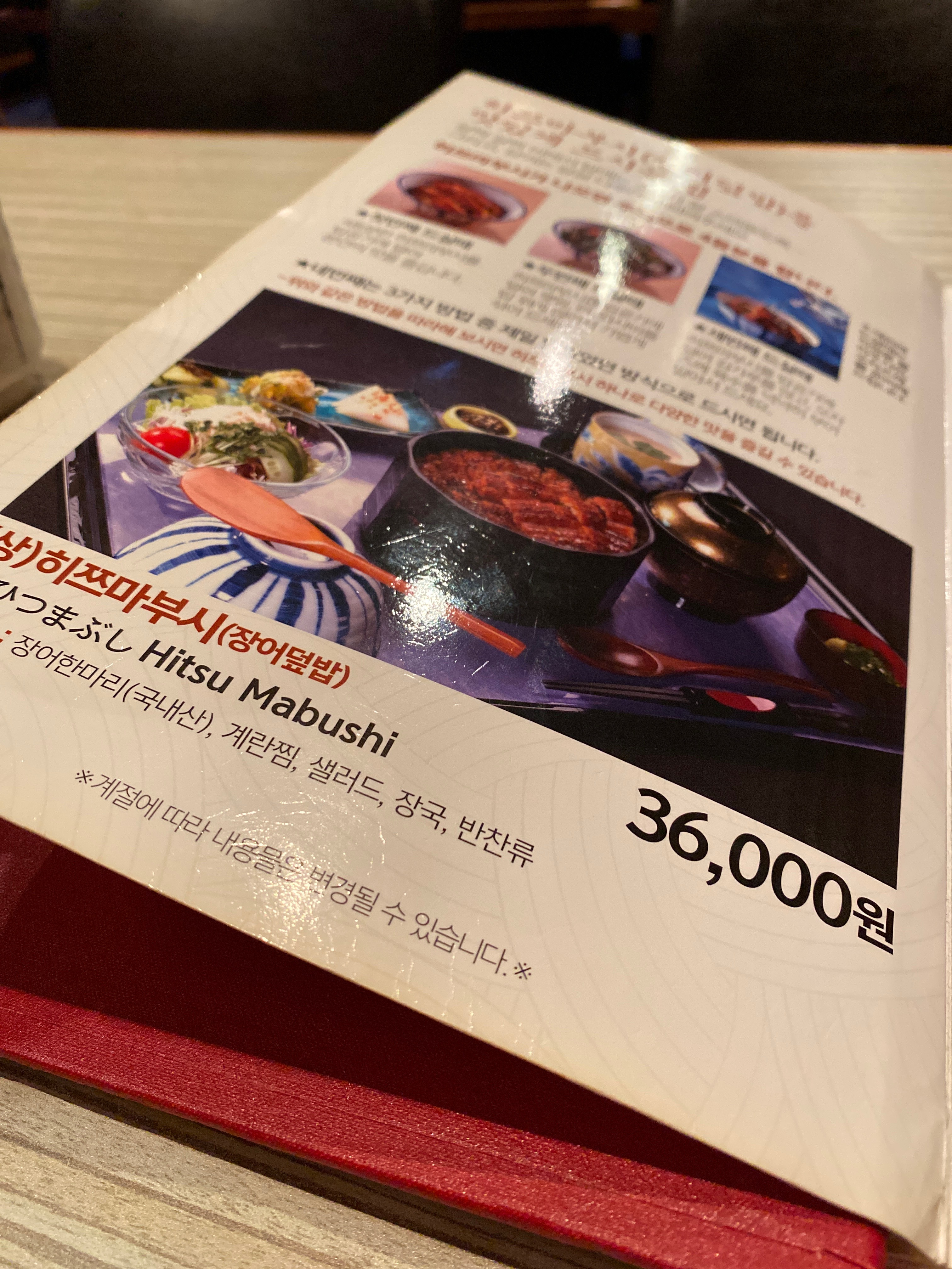 아무튼 장어요리 전문점인데 가격이 쎕니다.장어 정식이 2가지 타입이 있는데 3만원을 훌쩍 넘기고, 장어가 덮밥으로 안나오는 형태도 3만원이 넘습니다. 그외에 단품이나 장어 싫어하는 사람들을 위한 초밥 메뉴 등도 있습니다. 장어덮밥이 히즈미부시와 다른 방식이 있어서 물어보니 하나는 동경식이고 자기네는 히쯔마부시 전문점이라고 하시네요. 그리고 아예 밥땨로 장어따로 나오는 메뉴도 있습니다. 어떤 방식으로 주문하건 장어 정식은 36000원입니다.