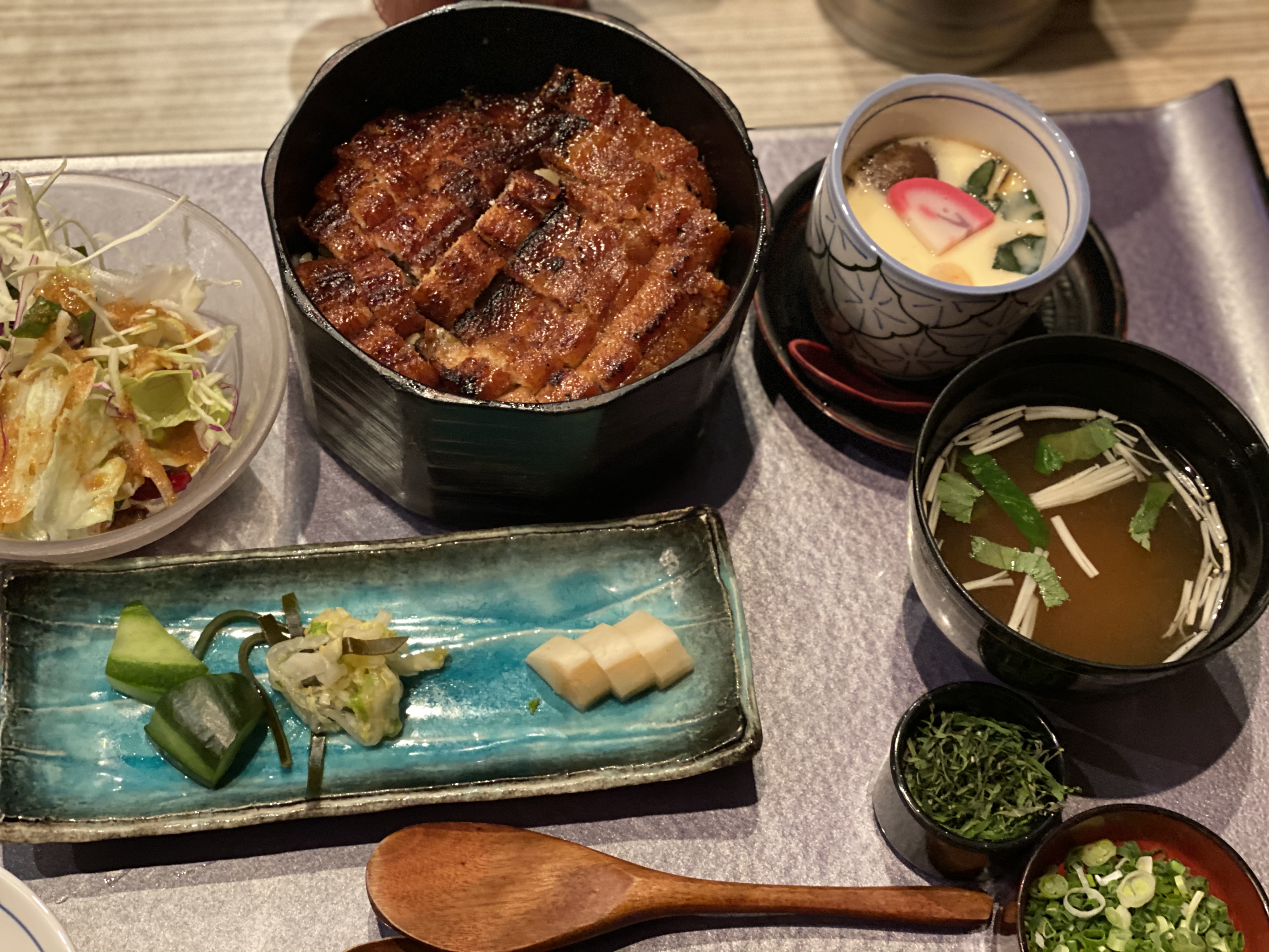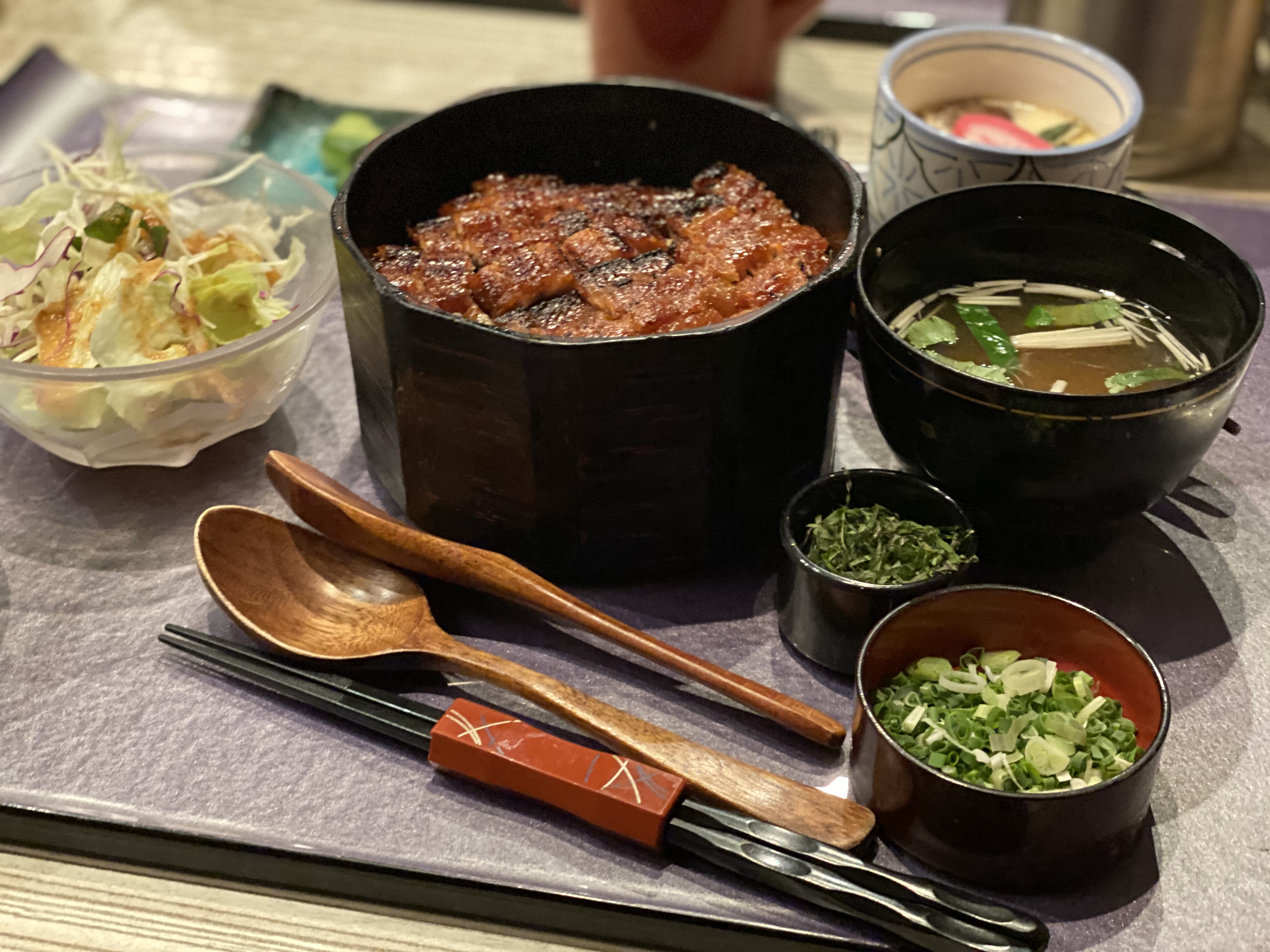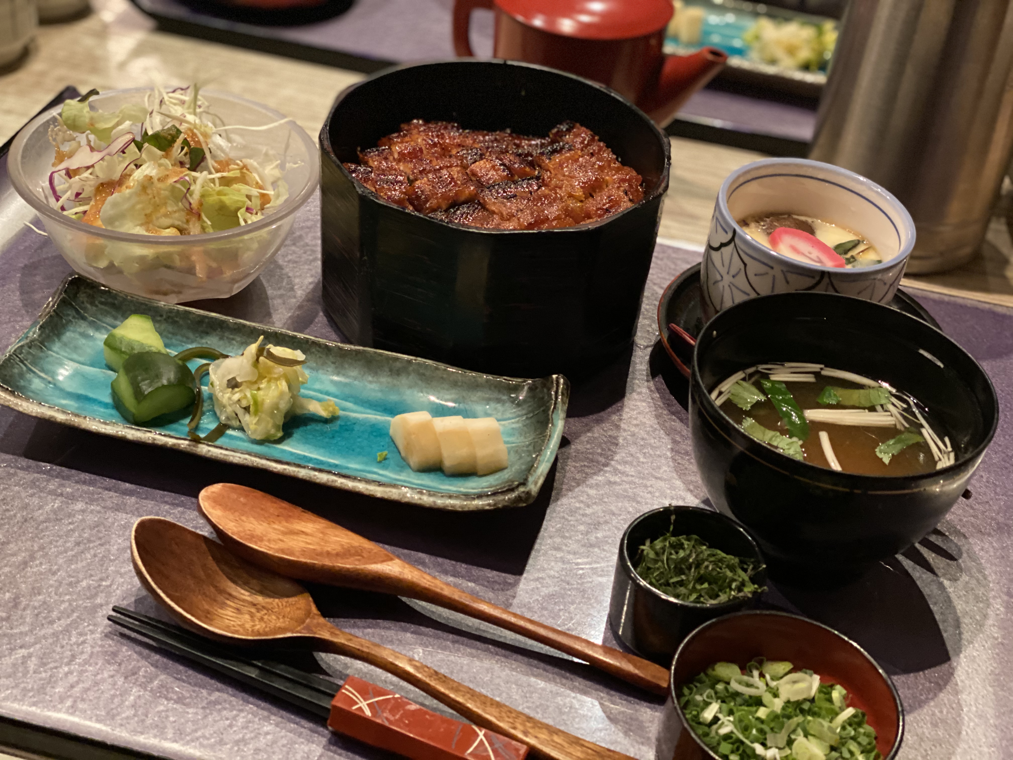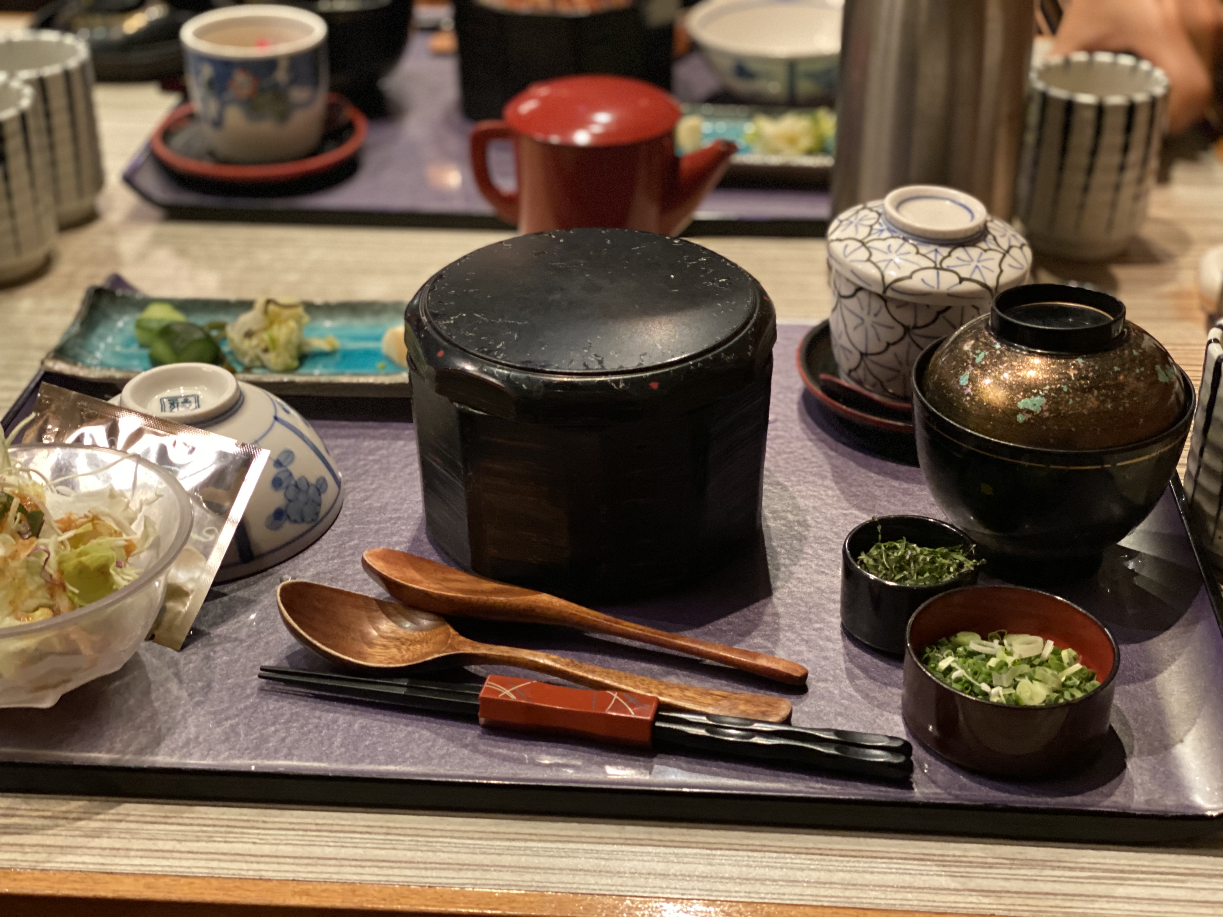 이건 제가 주문한 히쯔마부시 장어덮밥, 이렇게 덮어져서 나오고 저쪽 빨간 주전가가 차입니다. 이걸 나중에 밥그릇에 부어서 먹는거죠. 그리고 하나 덮어진건 달걀찜입니다. 뒤집어져있는 건 밥공기기이고, 검정색 뚜겅 덮어진건 미소 장국입니다.