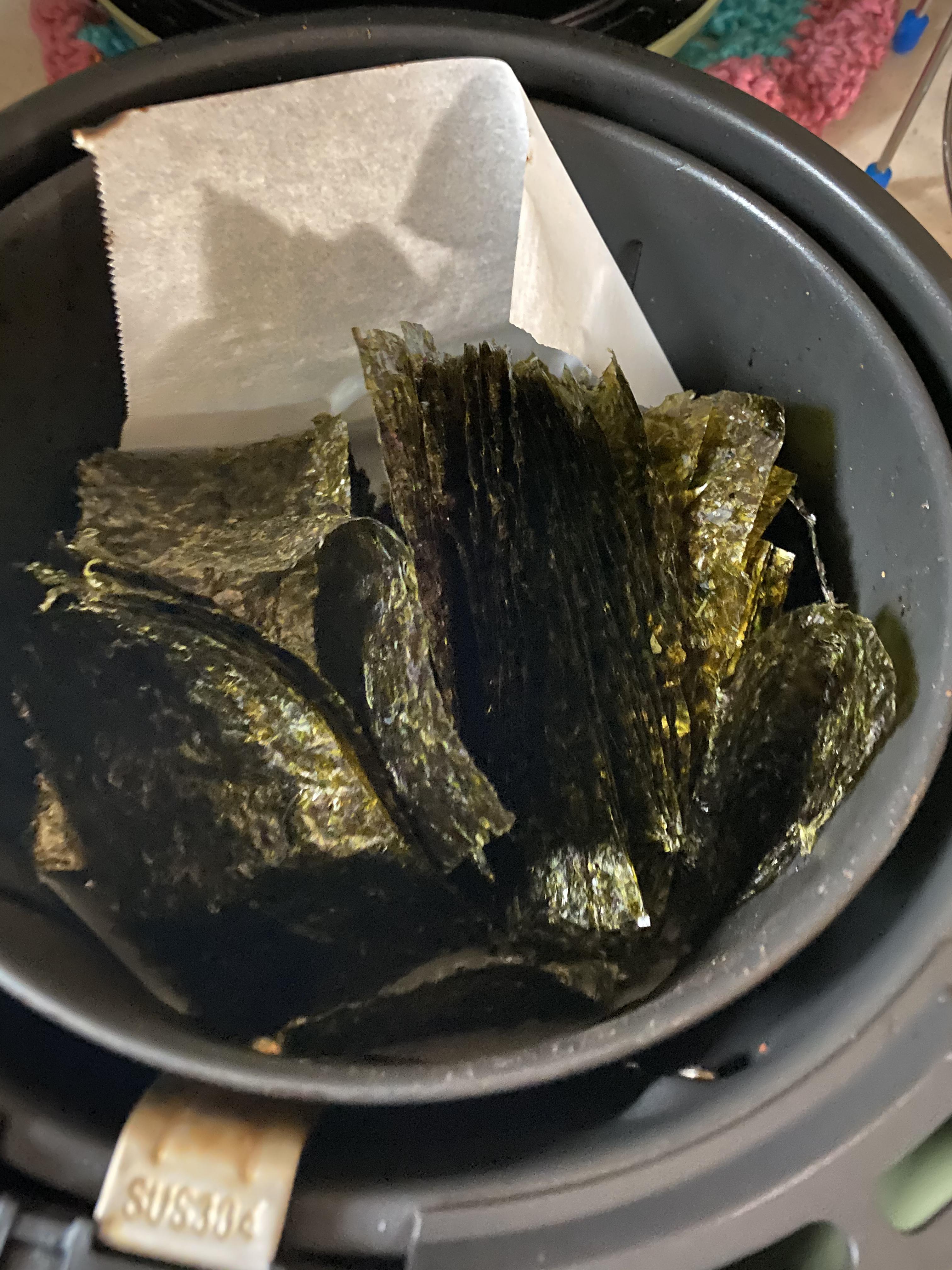 에어프라이어로 감자튀김만 구울 수 있는게 아니죠. 생선도 굽고 치킨도 만두도 기름 없이 즐길 수가 있죠 정말 좋아요 에어프라이어의 원리는 강한 열과 내부에서 부는 바람입니다. 그래서 바삭바삭한 음식들이 아주 맛있게 조리 되는 것이지요. 그래서 이런 생각을 하다 보면 김을 구으면 어떨까 하는 생각이 들었어요 인터넷을 찾아 보니 정말로 김을 구운 분들이 많이 있어요 그래서 아 이게 역시 되는 구나 싶어서 저도 김을 에어프라이어로 굽기에 도전했습니다.