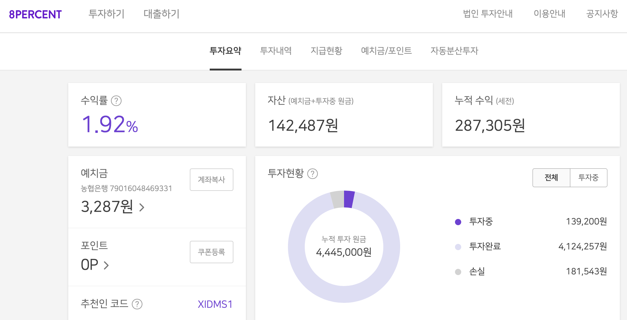 몇차례 8퍼센트 p2p 투자에 대해 적은 적이 있다.. 아직도 8퍼센트 투자하는 사람이 있냐 싶지만, 280만원 정도 8퍼센트에 투자해서 2년정도 이것저것 해봤다. 이제 8퍼센트에 남은 돈은 14만2천원 정도이다. 누적수익은 28만7천원.....그럴싸해보인다. 그렇지만 누적손실을 보면.. 18만1천원이다. 거의 똔똔이다. 아주 정확하게는 8퍼센트가 이야기하는대로 8퍼센트 수익은 절대로 나올 수 없다.