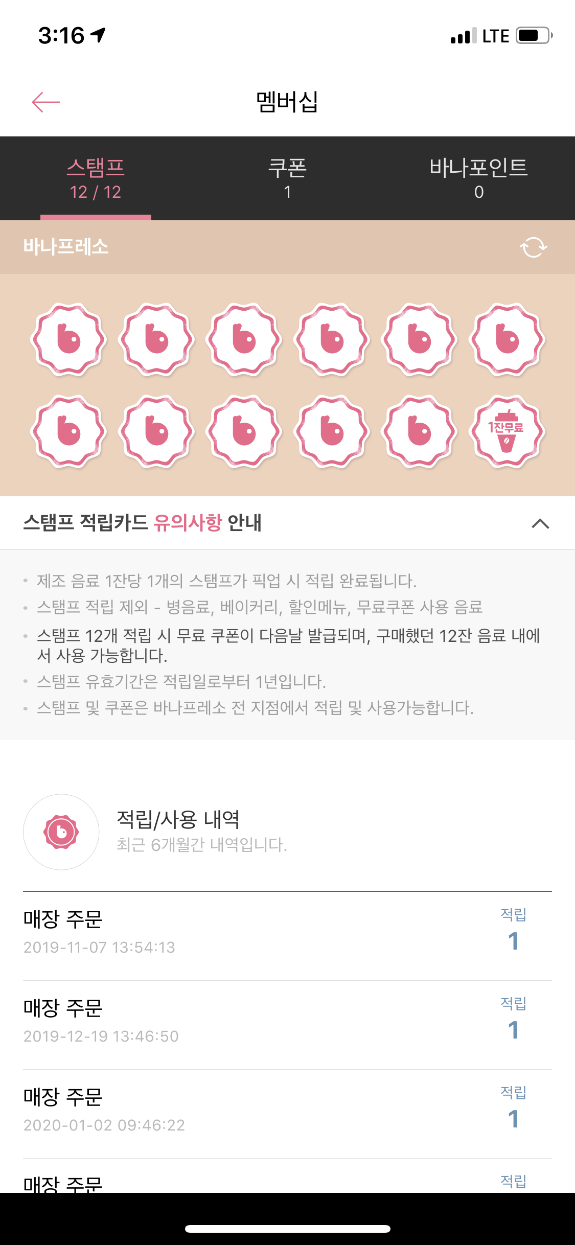 안 좋은 점은 두가진데 우선 적립. 보통 커피집들은 10잔 마시면 한잔 무료인데 바나프레소는 12번 주문해야 한다: