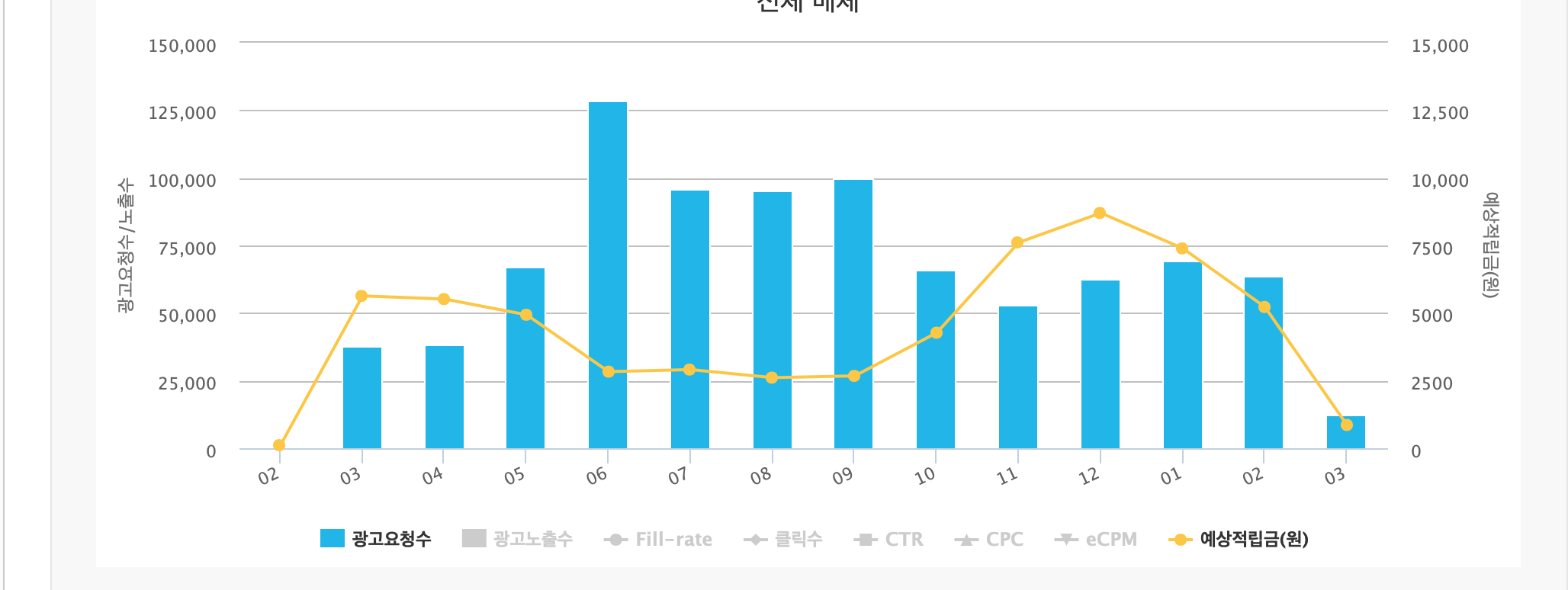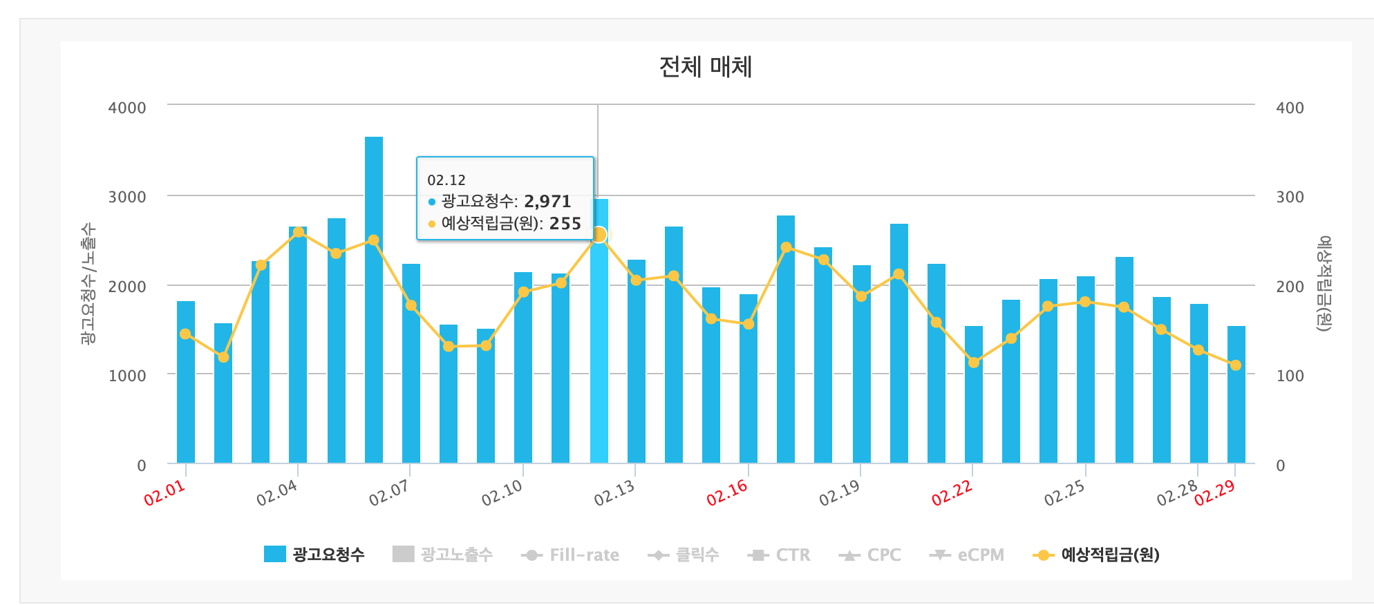 그나마 고무적인 것은 2월엔 일간 그래프는 광고의 요청과 정산이 대체로 같은 흐름을 보이고 있다는 점이다.