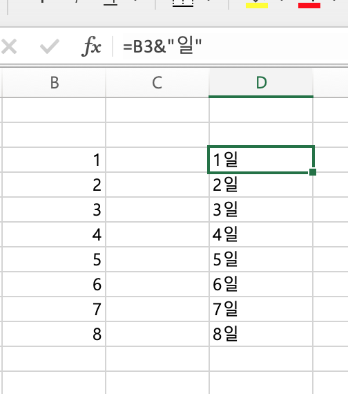 엑셀에 숫자 입력이 쭉 되어 있을때 이 숫자 뒤에 모두 '일'을 넣어서 1일 2일 5일 6일.. 이런식으로 바꾸고 싶다면..? 정말 상상만해도 자주 있을 것 같은데 귀찮은 일이다. 그러니까 아래 그림에서 숫자 뒤에 모두 1일 2일 3일.. 이렇게 바꾸고 싶은거다.
