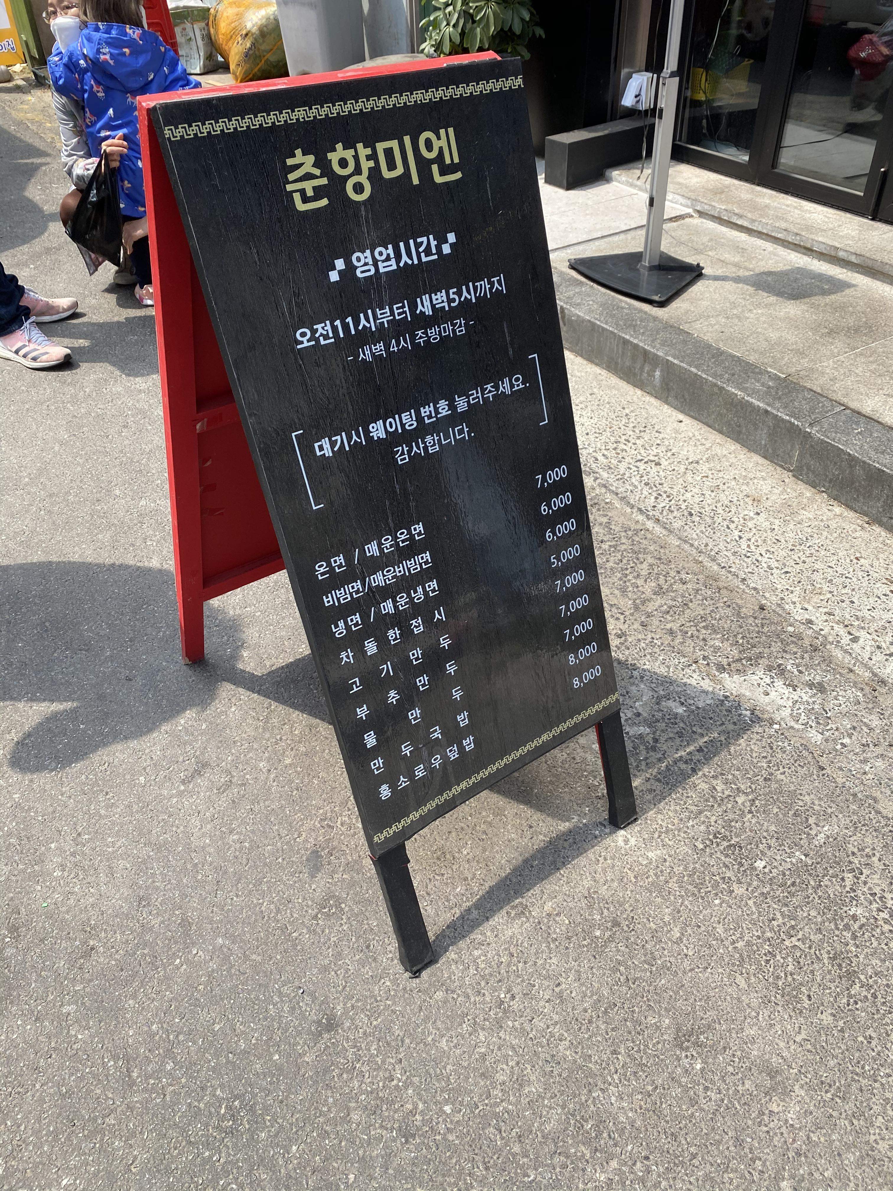 춘향미엔이 이전했다 같은 행당 시장. 원래 있던 곳에서 2분 거리로 확장하여 이전했다. 테이블도 훨씬 많아졌다. 전처럼 매장이 좁지도 않다. 여전히 사람들은 대기줄을 선다. 그만큼 장사가 잘 된다. 그런데 사실 가격이 꽤나 올랐다. 1년전 내가 춘향미엔 갔을 때보다 2천원 정도 오른 것 같다.