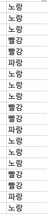 한 마디로 엑셀에서 이런 상태이다. 이 아래로 또 다른 색상이 있을 수도 있다, 대체 무슨무슨 색이 있는 것일까.. 그리고 각각의 색상은 몇 번 있을까?. 우선 중복을 제거하고 몇가지 색상이 나오는지 보자.