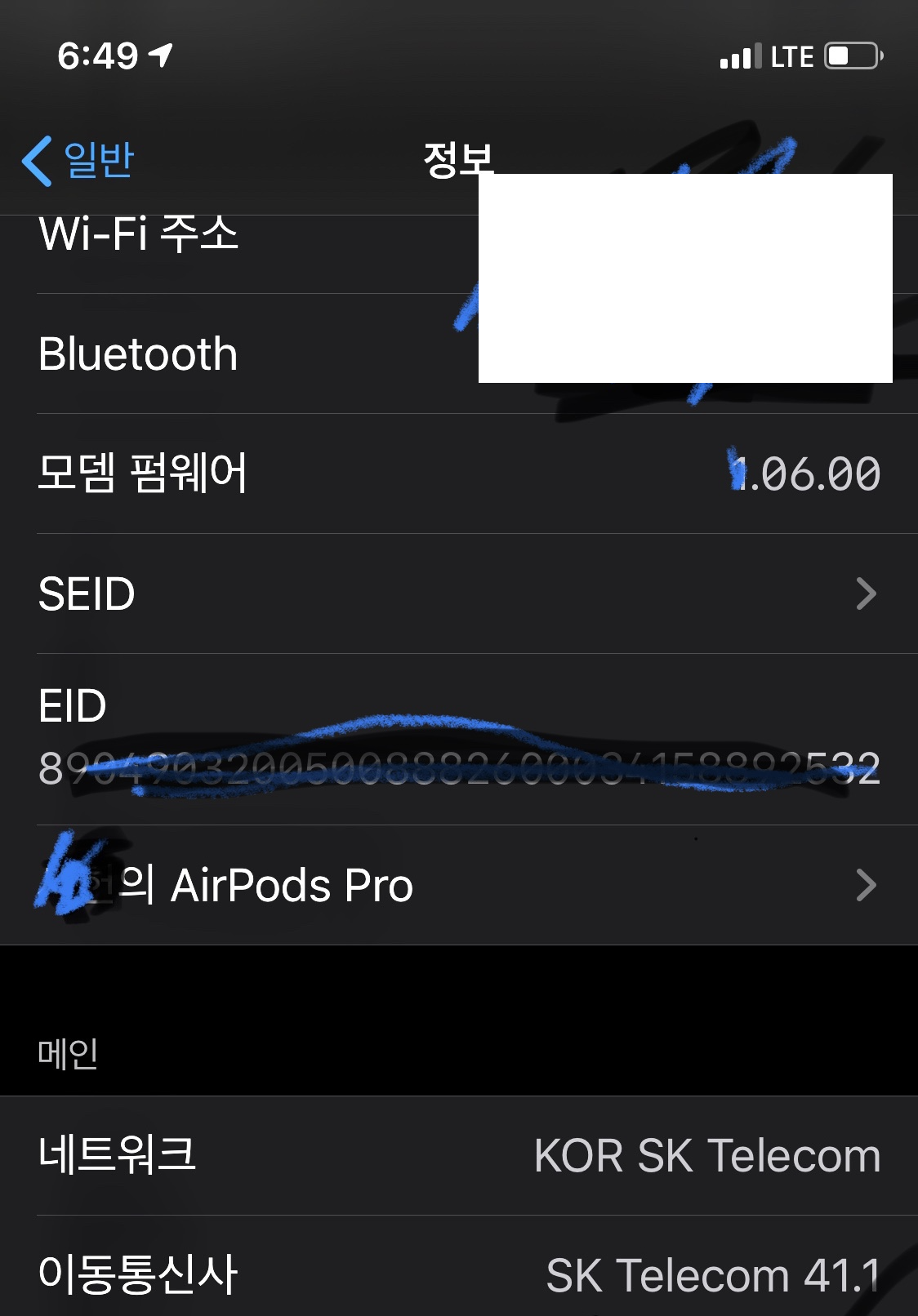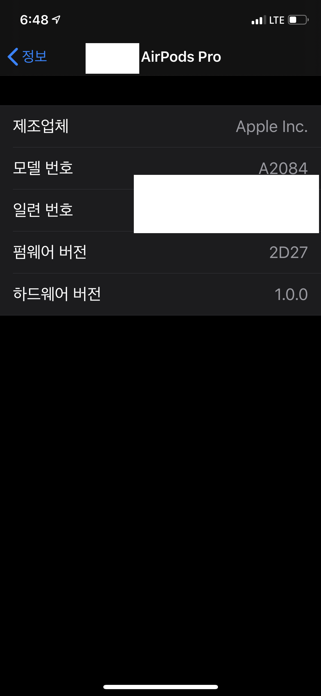 문제는 내 에어팟프로가 최신 업데이트 상태인지 그럼 어떻게 아는가 하는 점이다. 이것을 확인하는 것은 간단하다. 아이폰과 에어팟프로를 연결한 후 설정 - 일반 - 정보까지 들어가서 조금 아래로 내려보면 아래와 같이 에어팟프로가 연결된 것을 확인할 수 있다.
