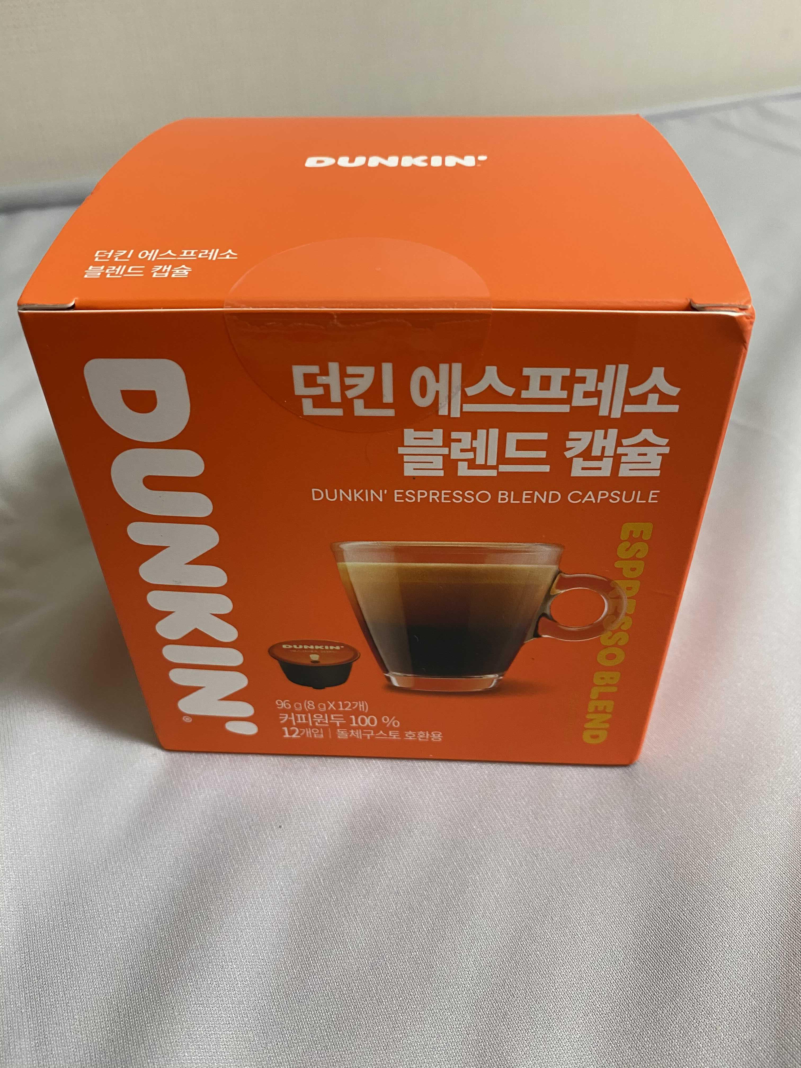 돌체구스토 캡슐이 전에 스타벅스 브랜드로 나온 바 있지만 최근에 던킨 에스프레소 브랜드로도 출시가 되어서 쿠팡에서 7200원에 무배 이길래 구매 해 봄.