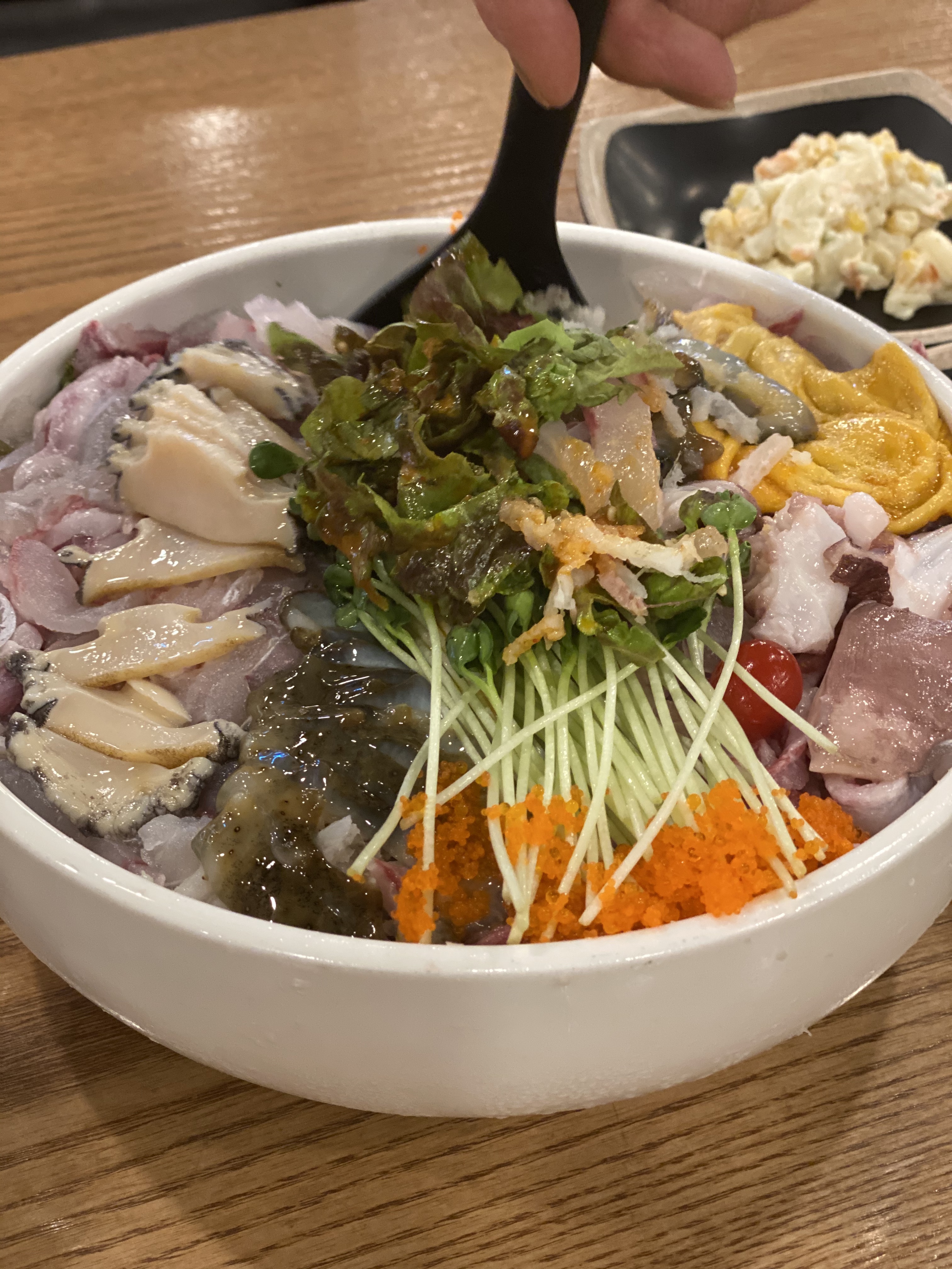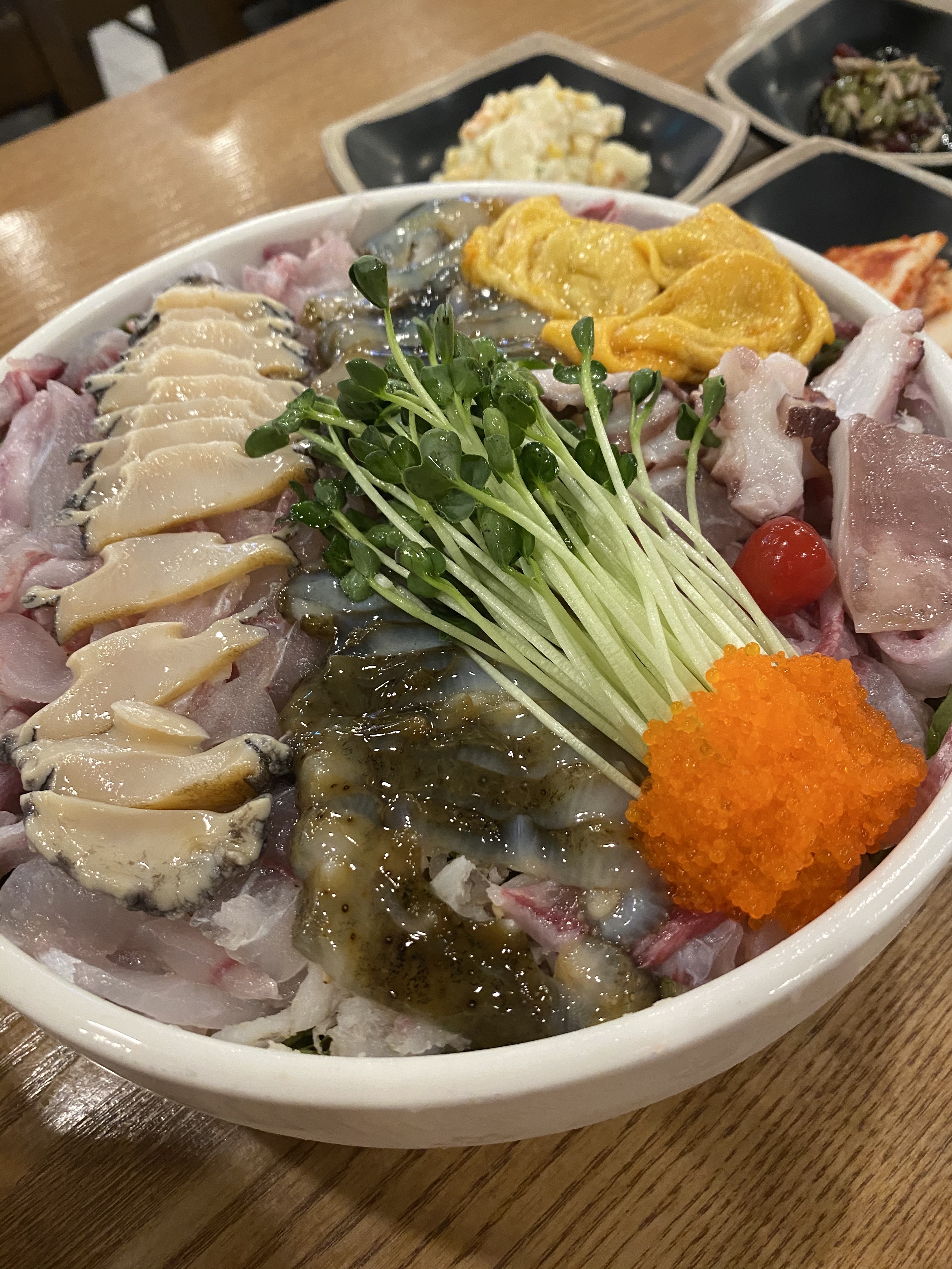 사진에서 보여지는 것처럼 아래 물회의 얼음이 깔려있고 위에 전복, 회, 멍게 등을 예쁘게 올려놓고 이걸 국자로 비빈 후 나눠먹는 것이다. 어느정도 먹었다 싶으면 애기공기 사이즈의 밥이나 국수를 말아먹으면 된다. 어린이가 있는 집은 사실 다른 메뉴를 시켜야 할 것 같다. 하지만 어지간한 다른 메뉴는 포지셔닝이 애매한... 결국 이 집은 물회 먹으러 와야 한다.