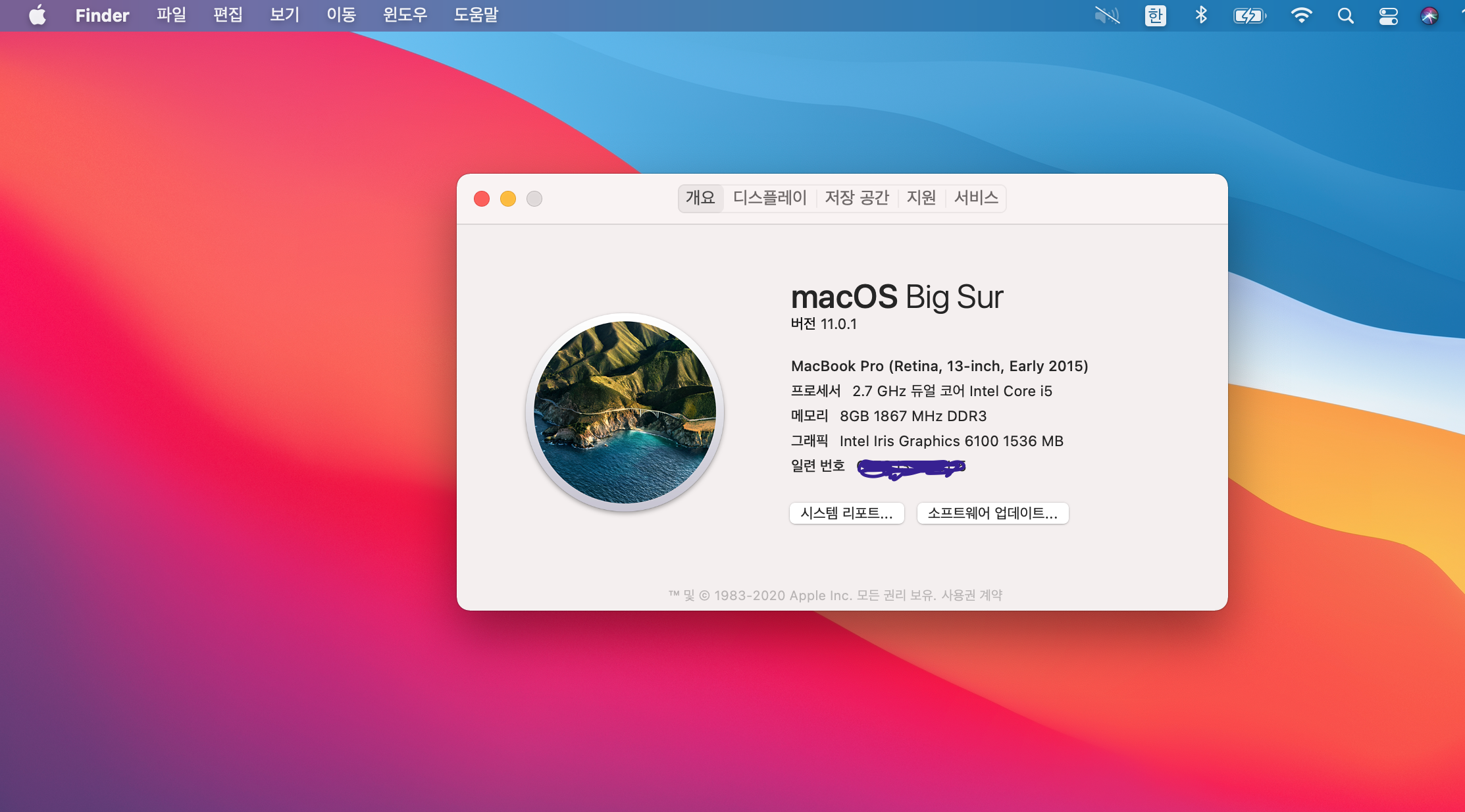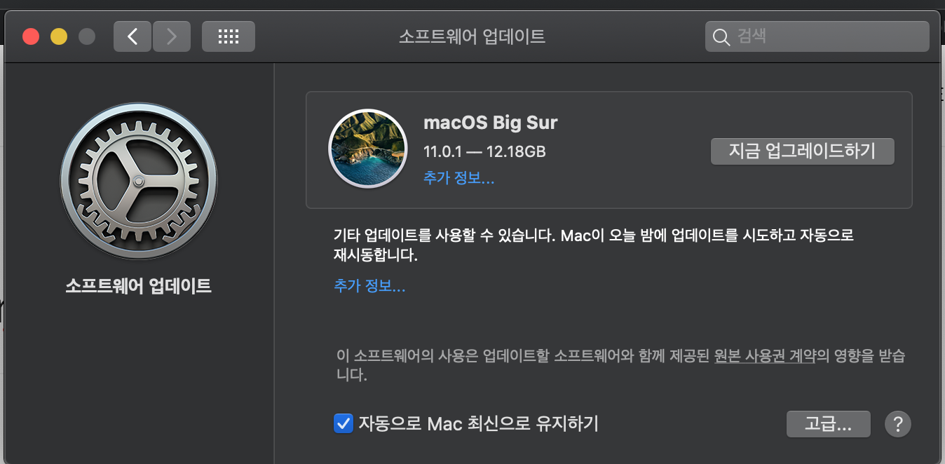 2020년 가을 드디어 맥os 새 버전 빅서 Big sur 의 배포가 시작되었다. 맥 OS 버전으로는 11.0.1 이라고 나온다. 언제나 그렇듯 다운로드에는 꽤 오랜 시간이 걸린다. 내 맥북은 2015년 early 버전임에도 불구하고 Big sur 가 설치된다. 와 !! 아침부터 다운로드를 걸어놨는데 꽤 오랜시간 다운로드를 진행한다. 그리고 추가적인 패치와 사파리 업데이트를 진행하고 있다.