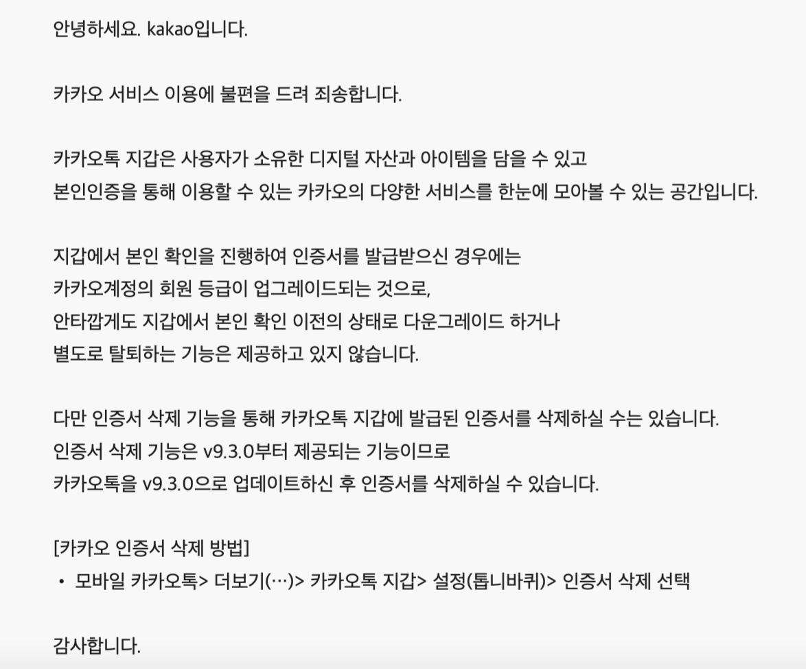 카카오톡 지갑 이라는 기능이 있다. 잔여백신을 알림받으려고 보통 설정을 하고 있었다. 하지만 잔여백신이 필요없는데도 자꾸 알림이 와서 짜증나서 지갑기능만 차단해서 끌려다보니 뭔가 찜찜했다. 카카오톡이 왜 내 인증서를 계속 가지고 있으려고 하는가? 여기저기 검색을 해보니 놀랍게도 이건 탈퇴하거나 해지하는 방법이 없없다. 고객센터로 문의를 보내니 아래와 같이 인증서를 지우는 방법 밖에 없단다. 결국 뭔가 찜찜한채로 인증서만 삭제하게 되는 것이다. 카카오는 왜 해당 기능의 탈퇴기능을 만들어 놓지 않았을까? 이 삭제는 '폐기'와 다르지 않나?