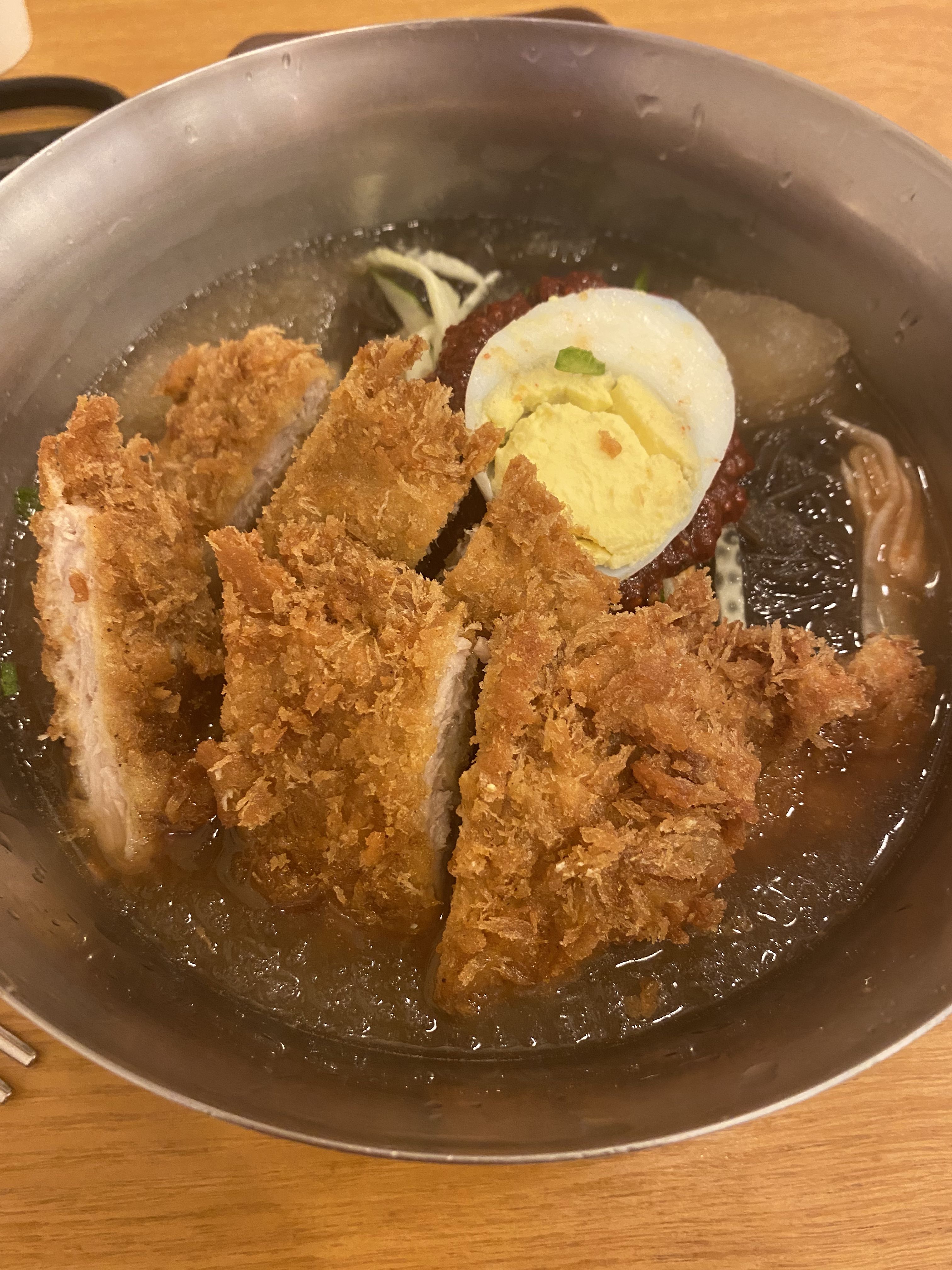 원래 주누돈까스냉면에 가면 돈까스를 소스와 따로 달라고 말씀드리는 편인데, 이날은 돈냉을 주문했다. 그래서 그냥 냉면 위에 돈까스가 올라가 있는 형태로 음식이 나왔다. 개인적으로 냉면에 다대기? 고추장 이런거 너무 많이 넣는거 싫어서 주누돈가스에서 주문하면, 일단 그걸 걷어낸다. 너무 매운거 싫어서. 그런데 이 집에서 매운 것 주문하는 분들 은근히 많더라는.