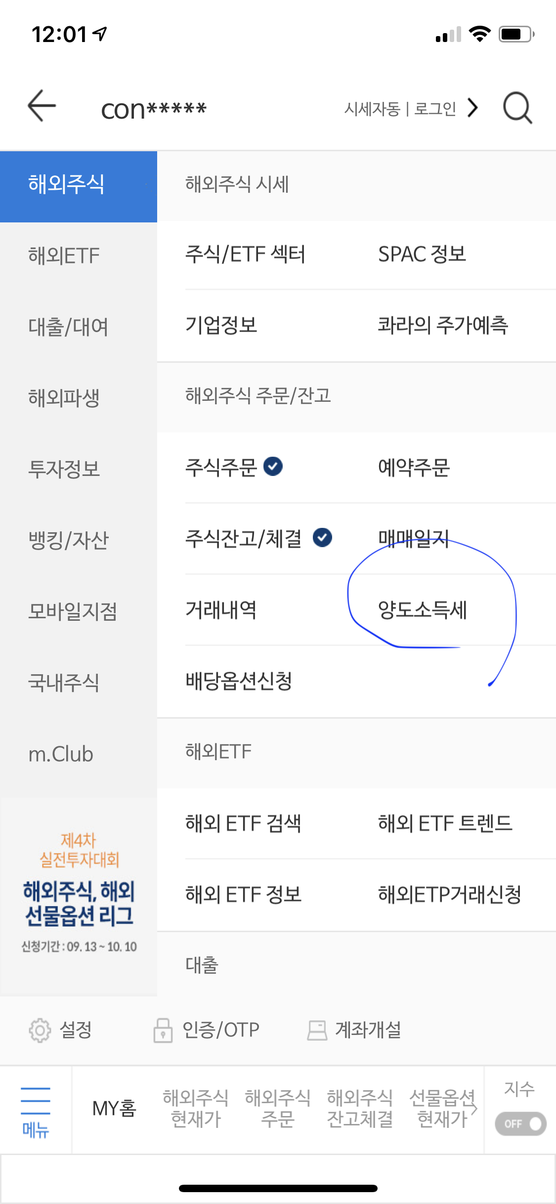 아 그리고 실제 세금을 내는 것과 관련하여 요즘엔 미래에셋의 경우 해외주식 거래 앱인 m.Global 앱에 양도세 관련 메뉴가 아예 생겼다. 물론 연초에 담당 지점 직원이 전화를해서 양도세 처리 절차를 도와드릴까요? 하고 물어보기도 하는데 그걸 이용하면 편리하다. 물론 앱에도 아래 화면 다음에 들어가면 양도세 신청을 하는 메뉴가 마련되었다.