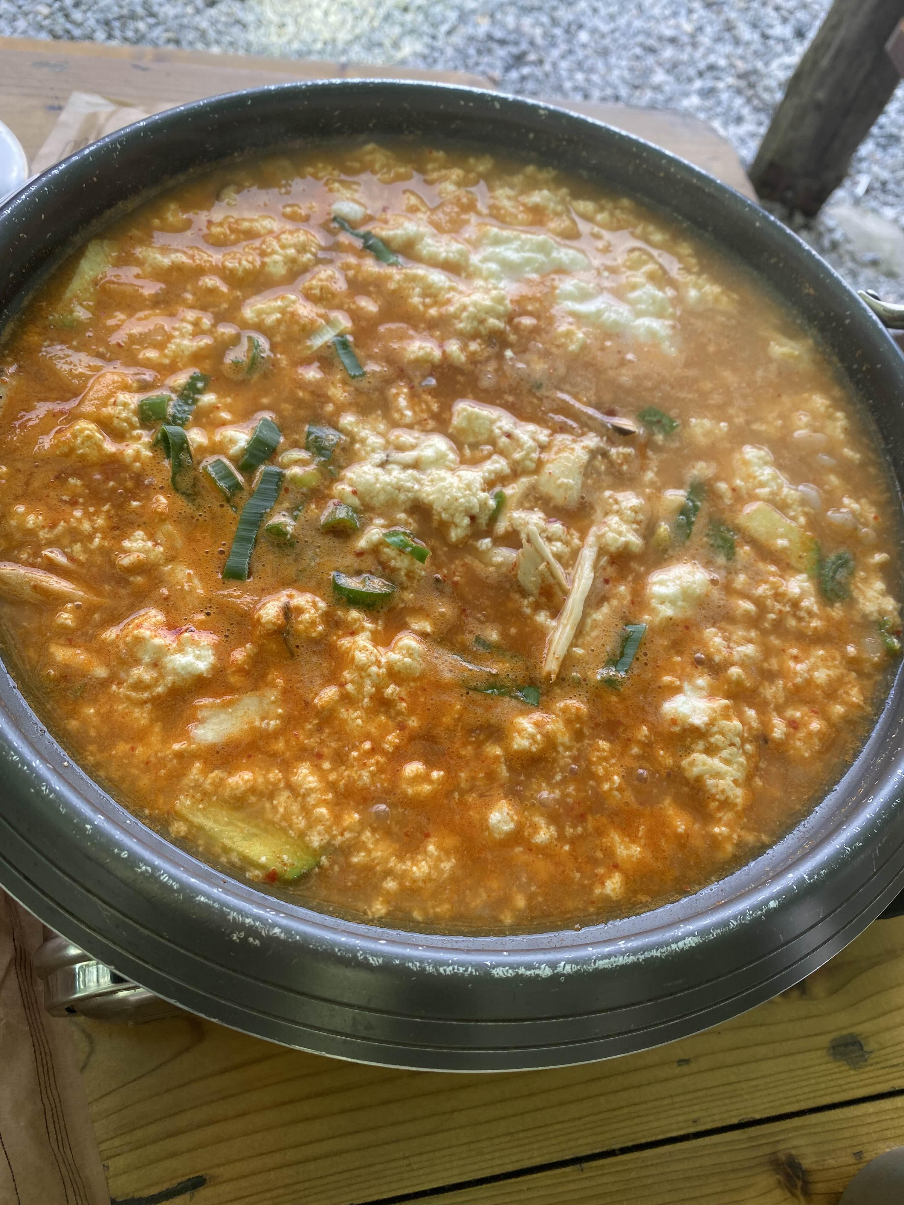 아침겸 점심으로 고향산천 초당 순두부 집을 갔어요. 그나마 여기는 밖에 앉아서 먹는 테이블이 있어서 강아지 동반이 가능한 식당이네요. 하지만 이 초당순두부 식당 거리에서 좀 맛은 그냥 그래요. 정식 인당 12000 원인데 잡채 하나, 모두부 몇개, 비지 나오고 찌개 나오고 그렇습니다. 강아지만 아니면 다른 식당 가겠어요, 아주 맛없는 건 아닌데 10000원만 받으면 어떨런지