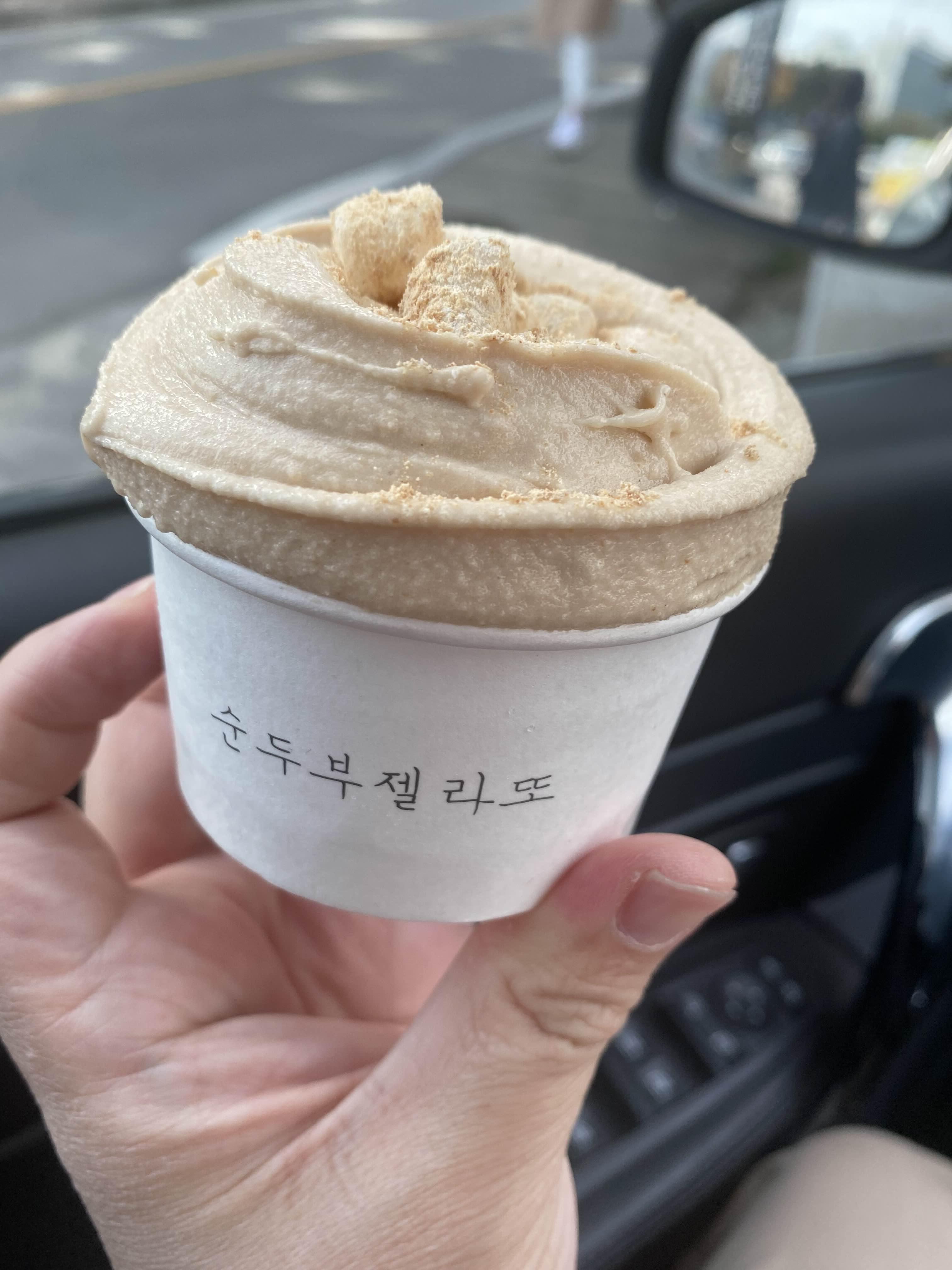 순두부 먹고나서 700미터 떨어진 순두부젤라또 어이스크림 먹으러 갔습니다 많은 곳에서 순두부 아이스크림 파는데 이 초당소나무집 순두부 아이스크림이 원조라고 하네요. 순두부 젤라또와 인절미 젤라또 두개를 주문했습니다. 각 3500원이러 그런데로 설득력있는 가격: 순두부 젤라또 첫 맛은 약간 콩국수 국물 맛이고 인절미 젤라또는 인절미 맛이에요.