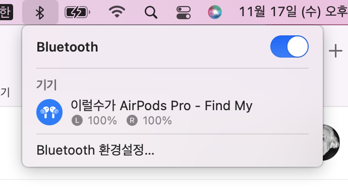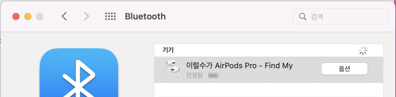 그런데 초기화를 시키는데 시간이 15초 정도 걸린다. 꾹 누르고 15 정도 세면 색상이 한번 바뀐다. 그때가 초기화가 된것이고 그때가야 맥북에 새로 에어팟 프로가 잡히는걸 확인할 수 있다.