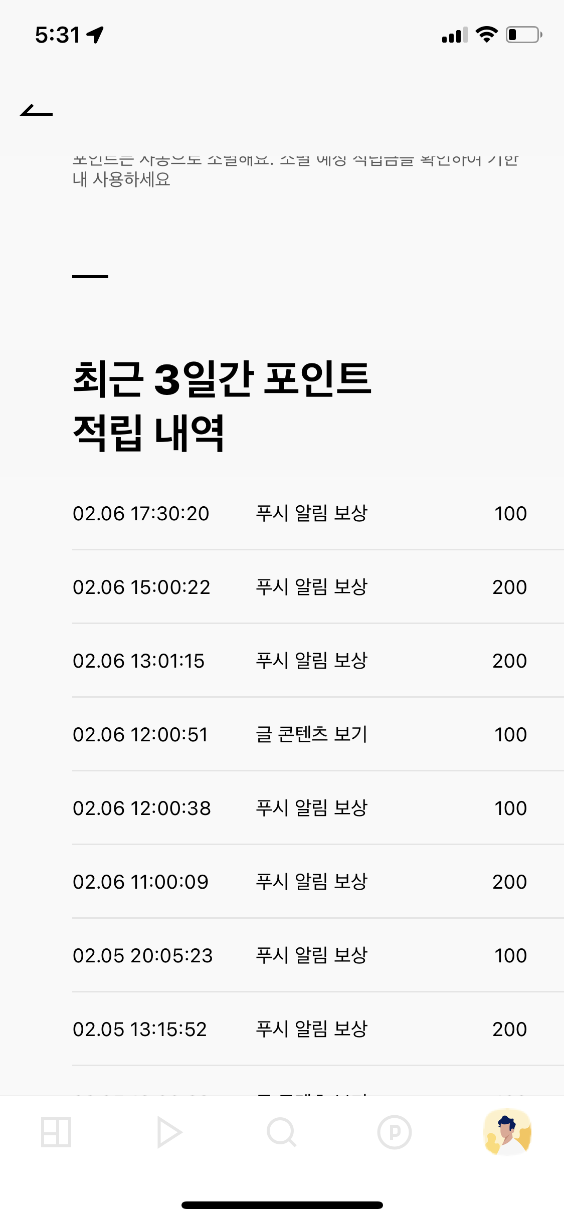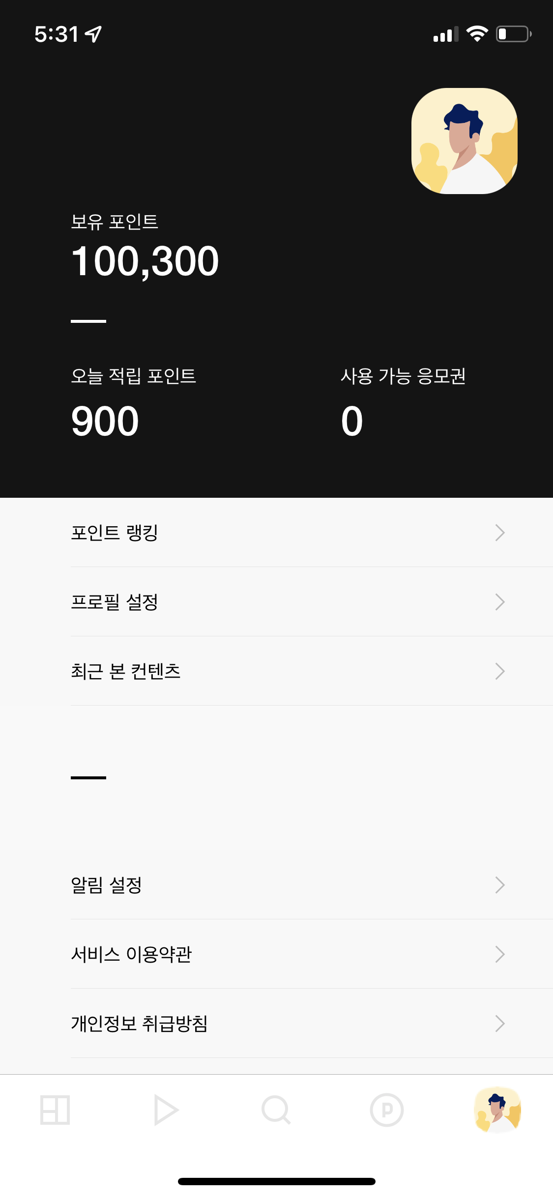 그 결과 2021년 가을에 설치했던 이 어플이 드디어 100,000 포인트에 도달 했다. 다음 주 쯤이면 104700 포인트로 사발면을 받고 먹을 수 있을 거 같은 데 그러면 나는 이 어플을 지울 생각이다 너무 리워드가 적고 알람이 짜증 나기 때문이다