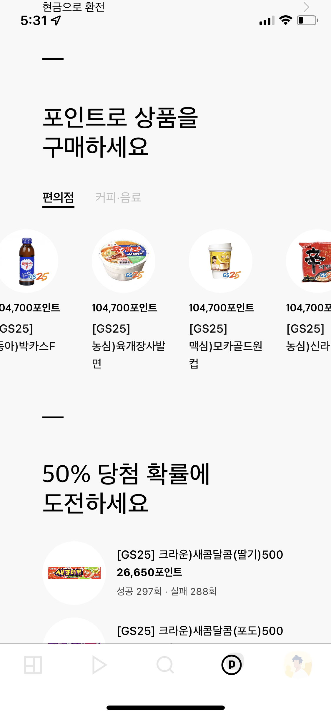 흔히 생각하는 캐시워크 같은 리워드 앱에 비해 리워드가 너무 형편없다. 어차피 뉴스는 읽지 않겠나 싶지만 그냥 포털에서 이 리워드 안 받고 보는게 낫겠다. 아래 화면은 그동안 리워드 모은 화면과 사발면 바꾸는 화면 이다.