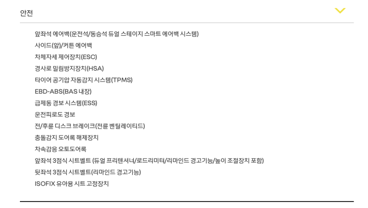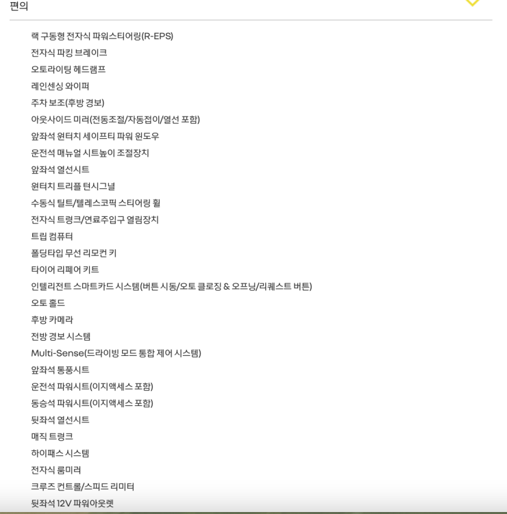 편의 기능 전자식 파킹 브레이크 원래 있던거고 오토라이팅 헤드램프 (이게 어댑티브인지는 확인이 필요), 주차 보조+후방카메라가 기본 이다. 원래 이거 기본 아니었는데, 아웃사이드 미러 열선 포함, 스페어 타이어는 이제 없고 타이어 리페어 키트, 전방 경고, 동승석 파워시트 (이거 손님 탈 때마다 미안했는데 이제 해결), 발 넣으면 열리는 매직 트렁크, (자동으로 닫히는 파워트렁크는 옶션), 크루즈 콘트롤, 스피드리미터가 기본 (오. 이게 기본? 하지만 어댑티브 크루즈 컨트롤은 아님), 앞좌석 통풍 시트 (시트에서 바람이 나오는 차구나)