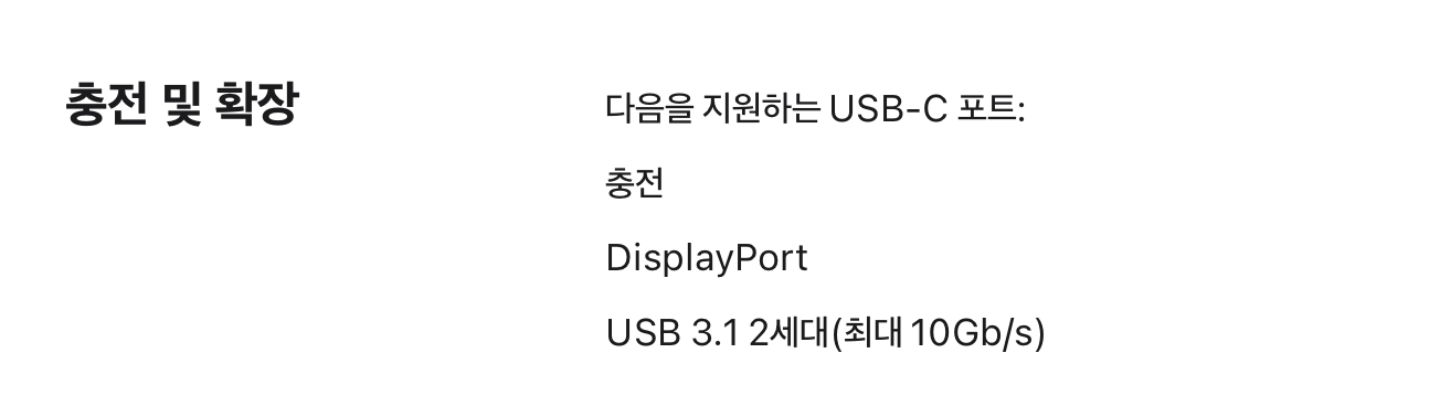 - USB-C 충전 케이블(1m) 이다. 썬더볼트도 아니다. .. 포트의 역할도 애플 홈페이지에 따르면.... 그냥 usb c 이다.