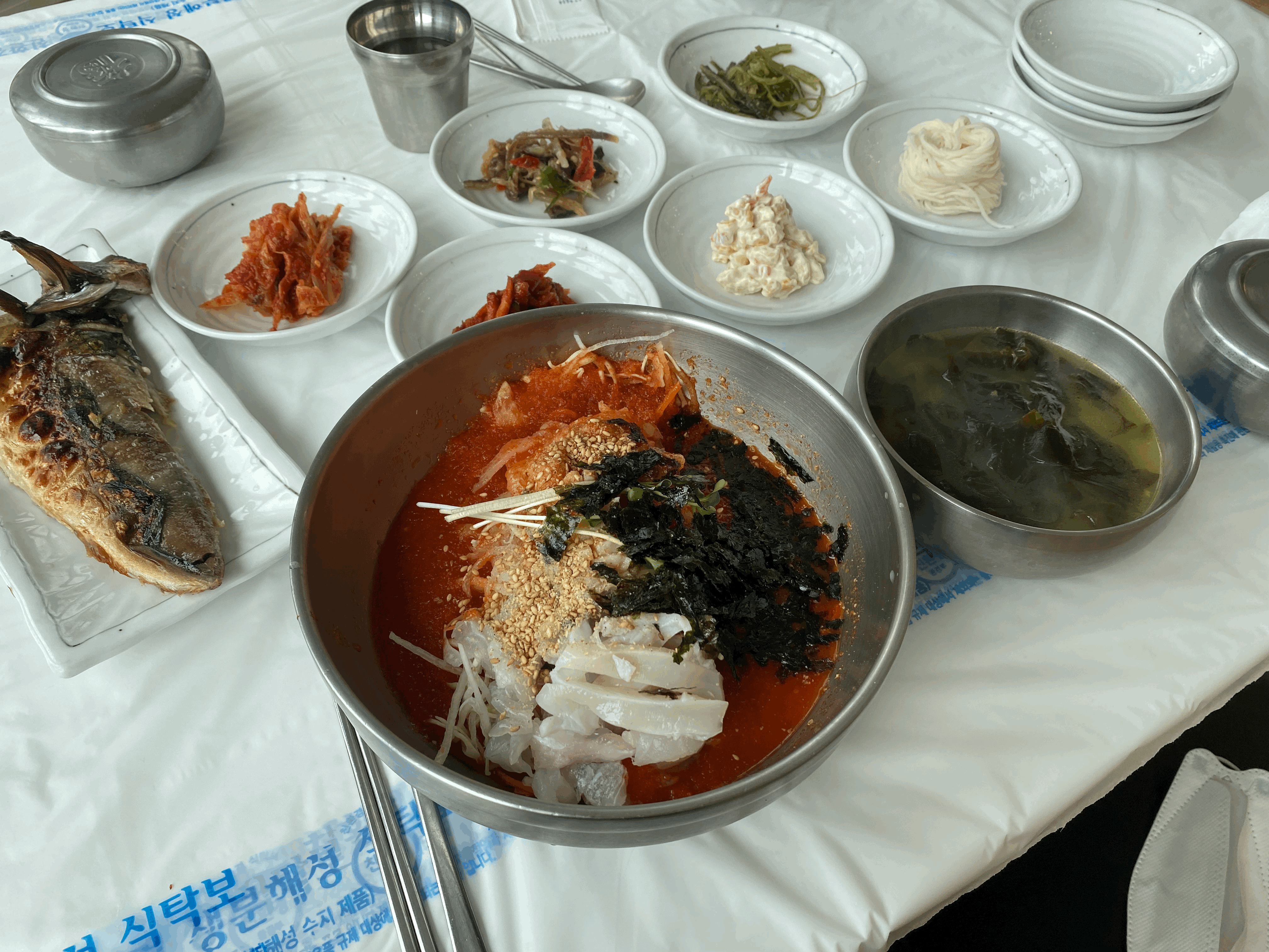 오. 미역국 이라는 키워드가 생각이 났고 미역국을 먹어야겠다는 생각과 애견을 검색하다가 사천포구 부근에서 애견 동반 가능한 식당을 발견. 미역국 후기도 너무 훌륭하고 생선구이와 물회 등등이 아주 훌륭하게 나오는 것 같았다. 가격이 다른 애견 불가 미역국 집 유명한 곳보다 몇 천원 더 비쌌지만 완전 후회는 없었다. 그런데 미역국을 너무 맛있게 먹어서 사진은 없고 ㅎㅎㅎ 물회 사진만 있다.