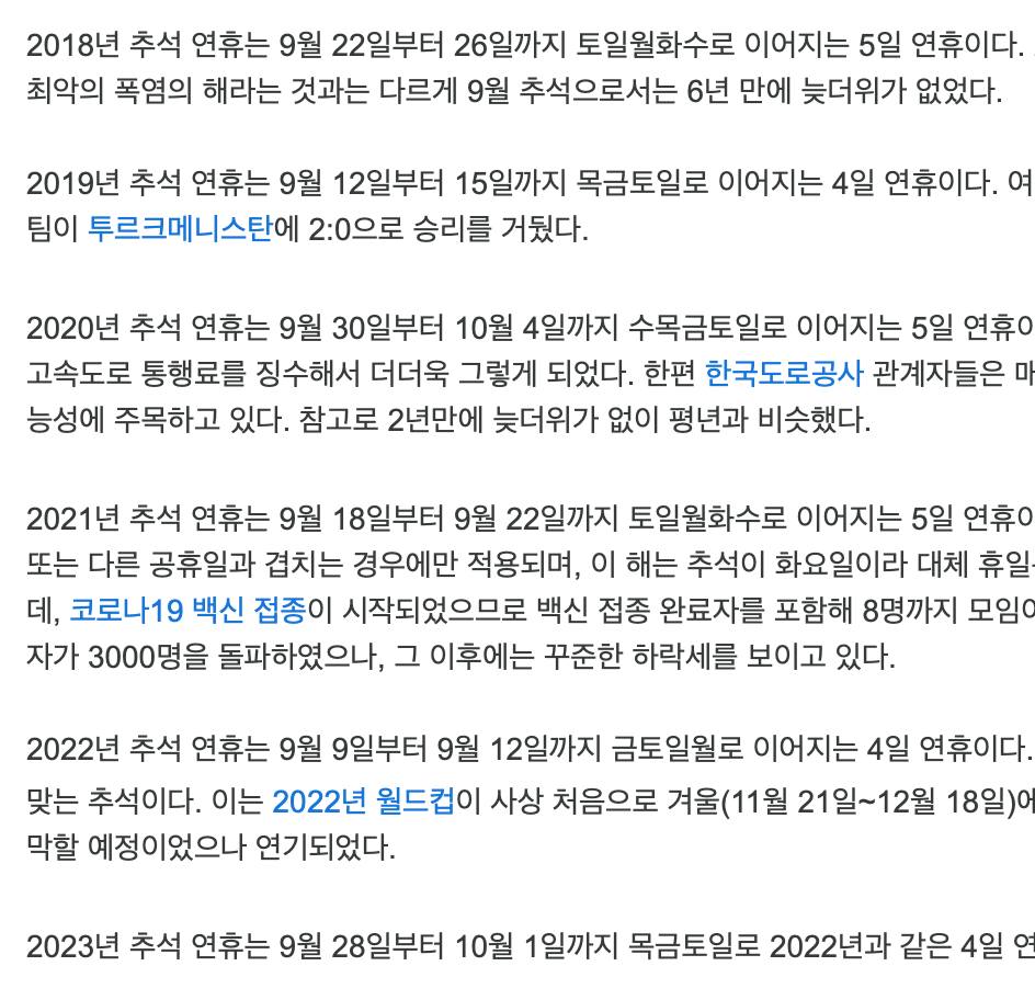 최근 5년간 추석과 관련한 기록은 나무위키에 아래와 같이 나와 있다. https://namu.wiki/w/추석 나무위키를 그다지 신뢰하지 않지만 팩트는 팩트니까.. 아무튼 올해 추석은 9월 10일 토요일부터이고 연휴는 9월 9일 금요일 부터인 셈이다.