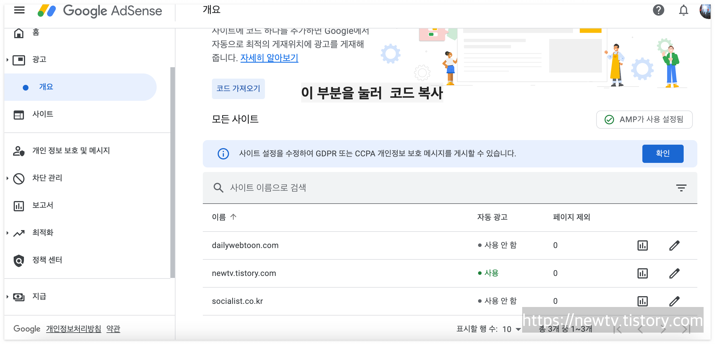 왼쪽 메뉴 광고를 누르고 코드를 다시 확인하여 복사하는 방법도 있습니다.
