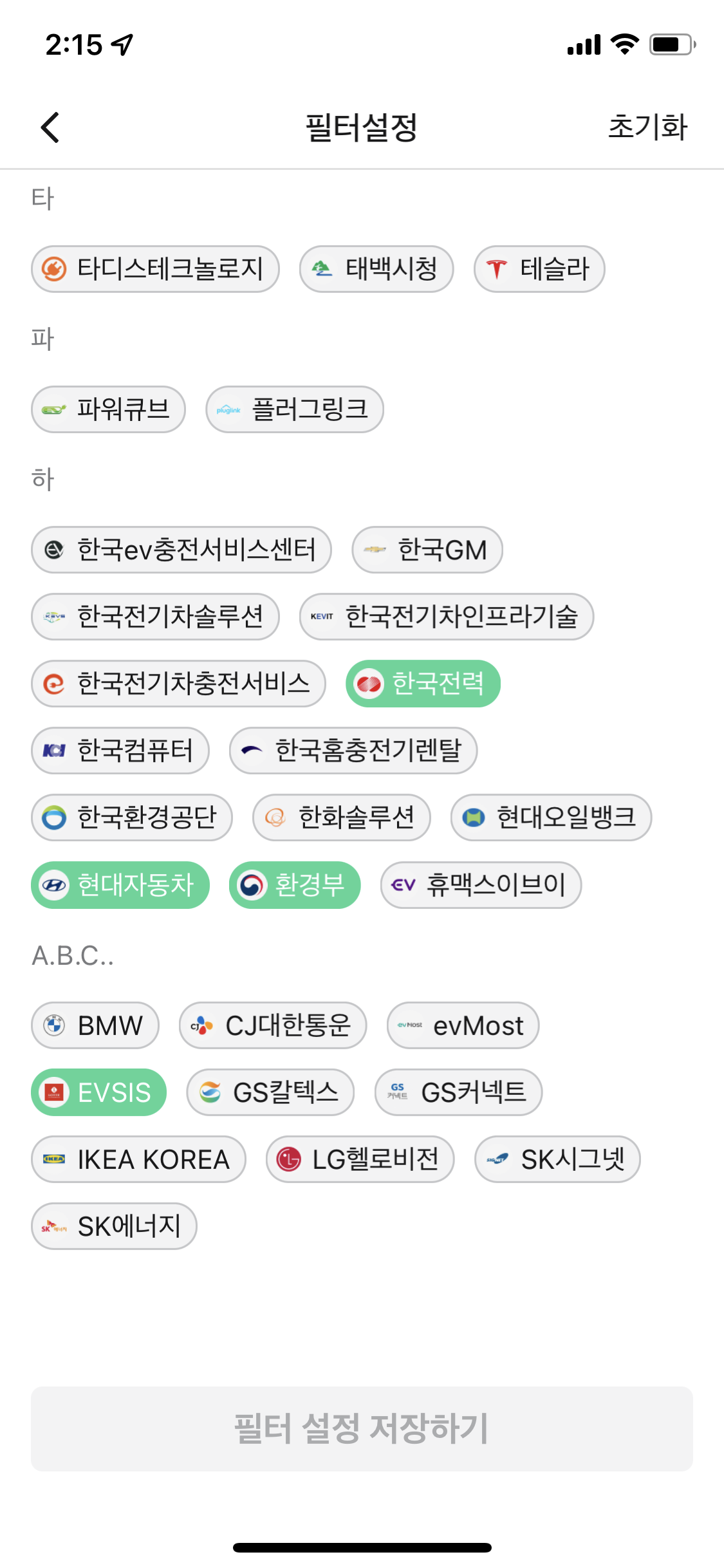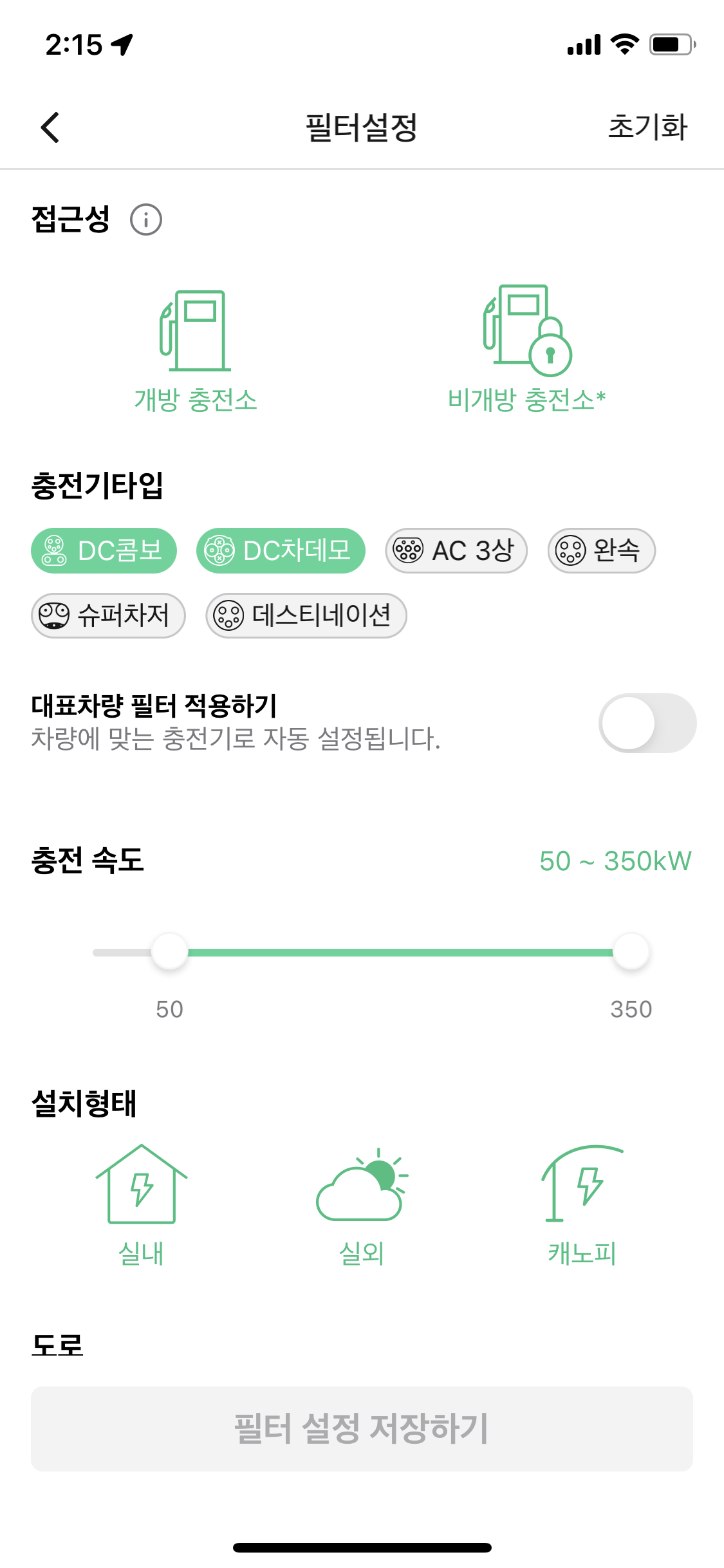 제주 전기차 충전에는 EV 앱이 필요하다 여기에서 권장하는대로 제주시가 운영하는 충전소와 한전이 운영하는 충전소로 한정하고 자신이 빌린 차의 기종에 따라 충전타입을 정해놓고 충전소가 발견되도록 해 놓으면 된다. EV앱 필터 설정 화면은 아래와 같다.