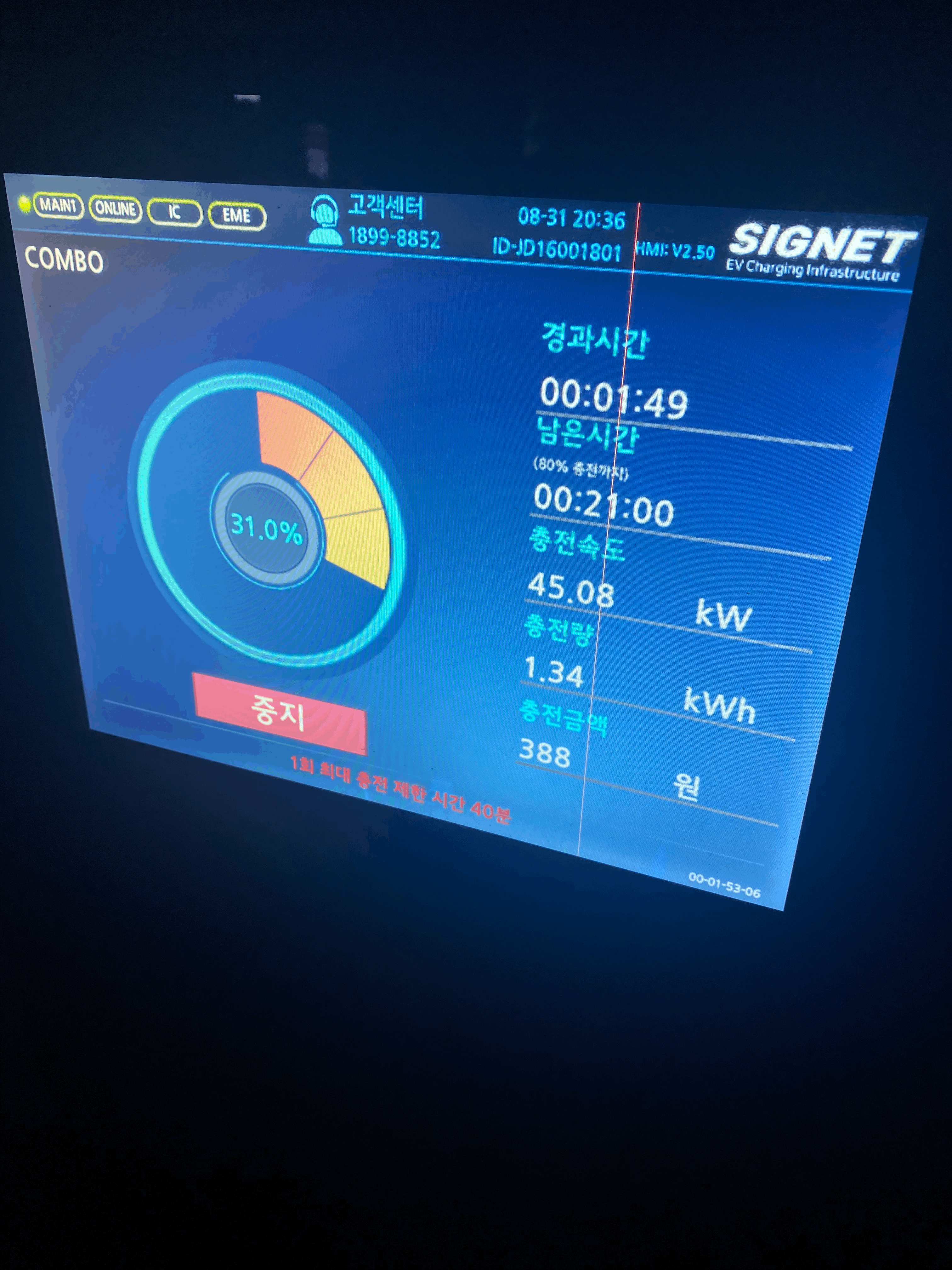 충전 기계마다 모니터화면이 다 다른데 처음 충전하는 충전시설에는 충전 소요시간이 나온다. 아... 그런데 너무 오래 걸린다. 제주여행 기간 중 충전을 3번정도 해봤는데 여기가 가장 오래걸렸다.