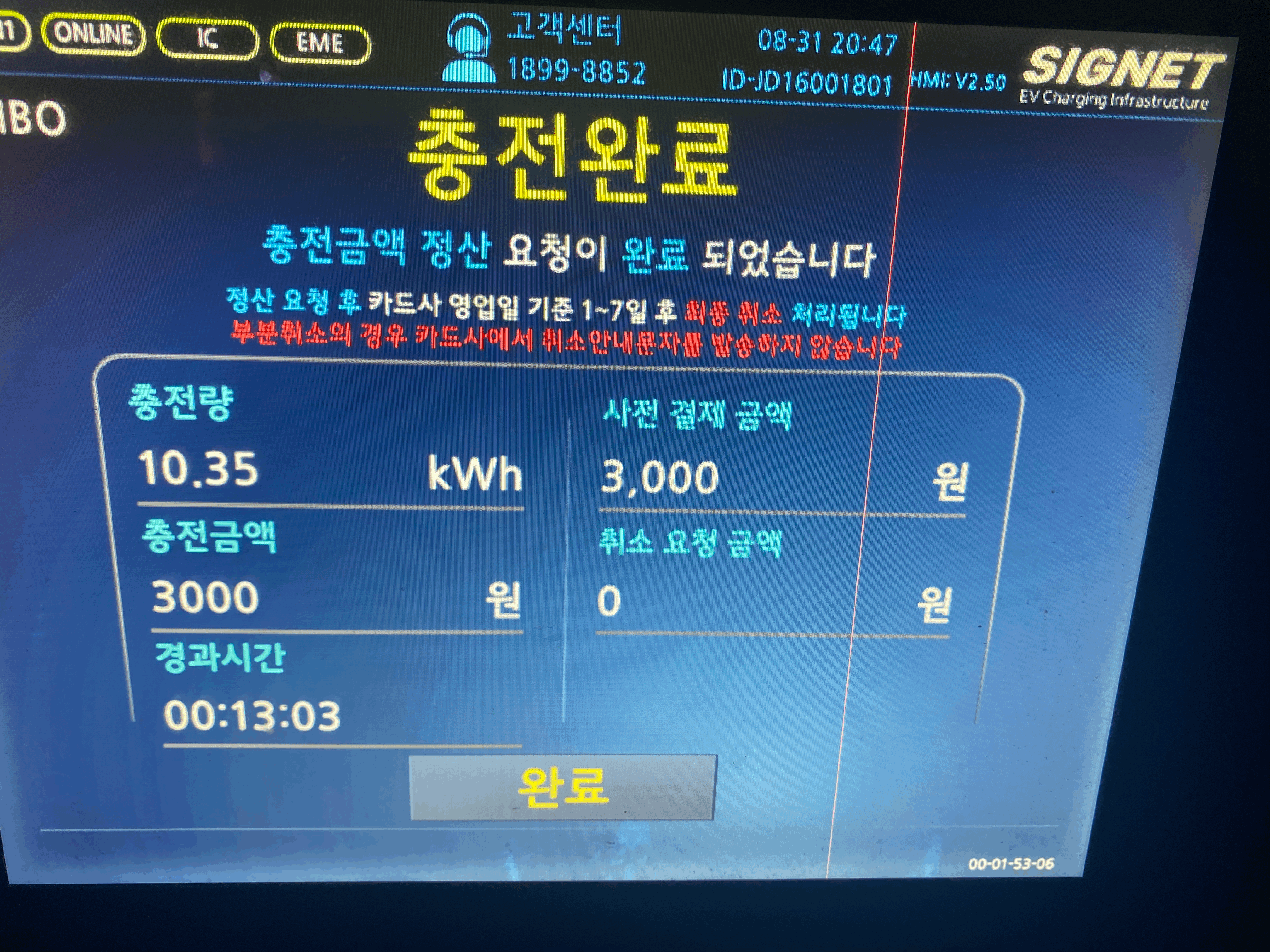 보여지는 것처럼 3천원 충전하는데 13분 정도 걸렸다. 그런데 여기서 궁금증이 생긴다. 선불인데 만약 충전량이 내가 충전하겠다고 입력한 금백보다 적으면 환불은? 이게 좀 아직 답답한 부분인데 고객센터에 알아보니 카드사에 따라 환불규정이 달라서 몇일의 시간이 소요된다고 하는 것이다. 그러니까 내가 1만원 충전하겠다고 하고 실제 3천원 충전하면 최종 정산은 몇일 지나서 카드사로 실제 정산이 되어 결과를 알수 있게 되는 약간 찜찜한 구조이다. 물론 여행을 돌아와서 하루 만에 카드사에서 문자가 와서 실제로 청구한 금액을 제외하고 더 많은 금액을 충전하겠다고 설정한 금액은 다 제외가 되었지만 여행자 입장에선 조금 찜찜한 것이 사실. 그냥 후불제로 하는건 '무인 충전'이다보니 영 찜찜할테고 말이다.