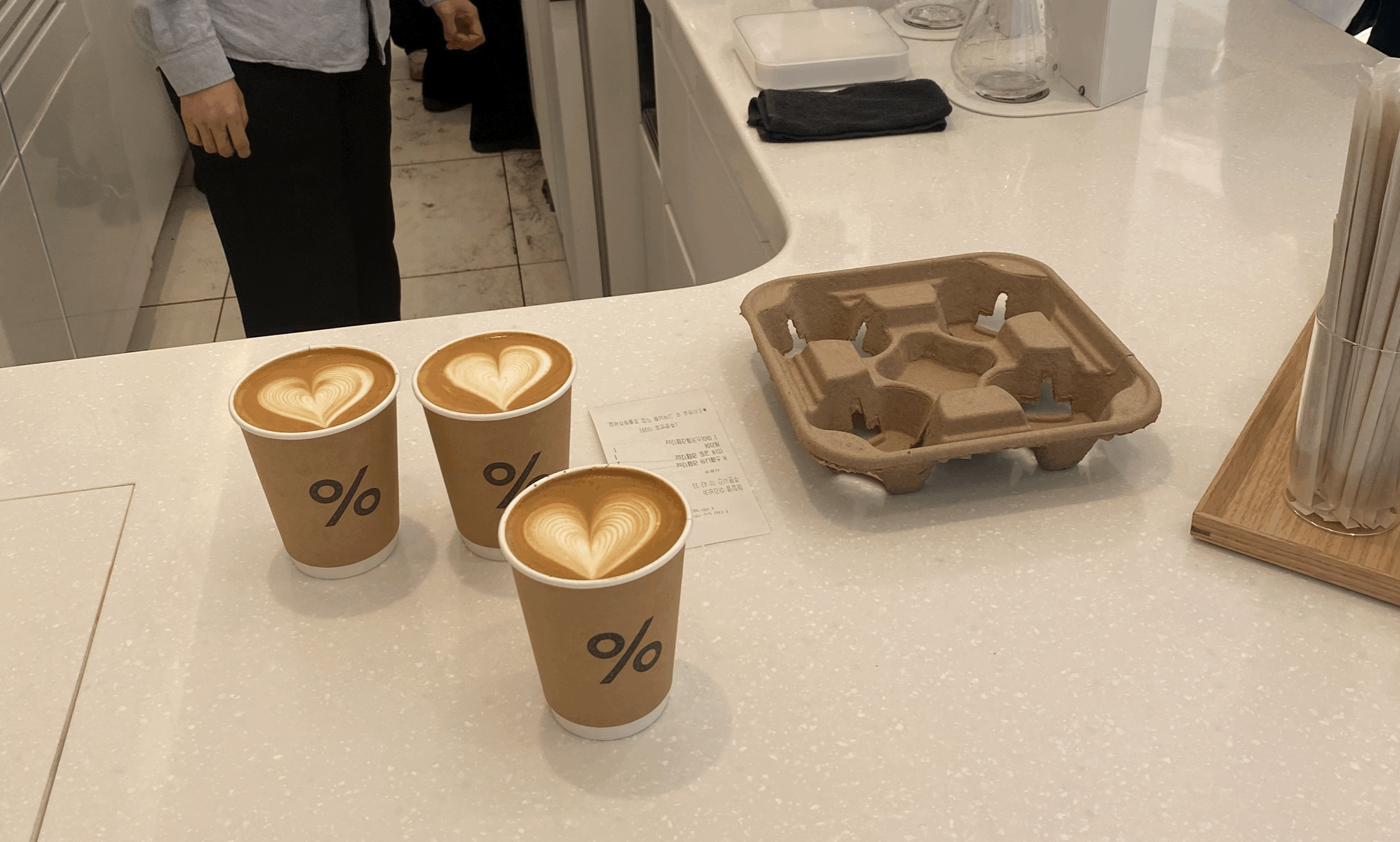퍼센트아라비카 $아라비카 라는 커피가 한국에 들어왔다고 하는데 마침 회사근처기도 해서 팀원들과 가봤다. 평일 아침 10시에 연다. 테이크아웃 투고 하는 아침 커피는 아니라는 거다. 코엑스 별마당 2층 야외에 있는 매장이다. 런칭하고 초기여서 그런지 늘 사람이 많다. 우리가 10시에 문을 열었을대 맨 앞에 있는 분에게 얼마나 기다리셨어요? 했더니 9시 30분쯤 왔다길래, 아 30분쯤 기다리면 되려나 하고 줄을 섰는데 실제로 매장안에 들어가는데까지는 40분 정도 걸렸다. 그리고 매장에 들어가서 주문을 하고 커피를 내려서 라떼를 만들어주는데 20분에서 30분 정도 . 결국 총 1시간 정도 걸렸다.가격대는 역시나 블루보틀 정도 가격.