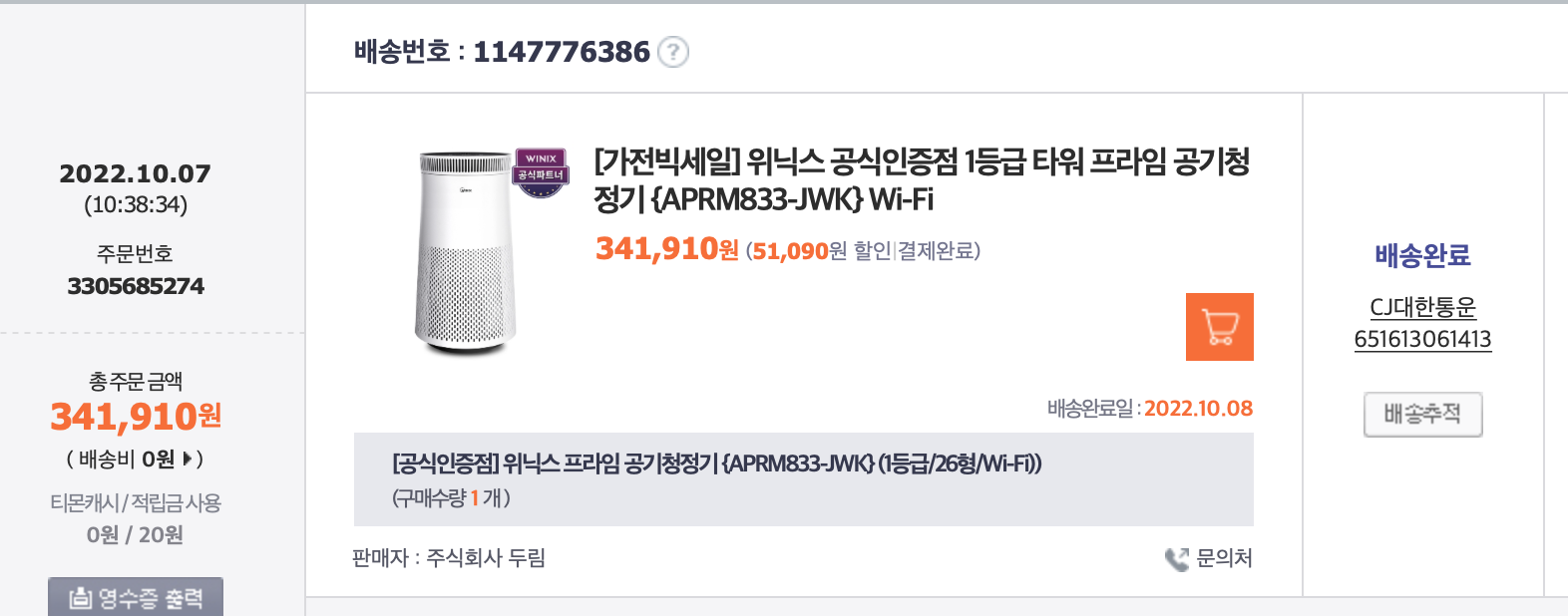 11번가에서 최저가로 구매했다가 배송이 지연된다고 하길래 너무 어이없어서 티몬에서 다른 사업자에게 구매했다. 위닉스 제품 중에서는 새 제품도 있지만 가장 큰 용량이라고 할 수 잇었다. 34만1천원 정도 내고 샀다. 내돈 내산