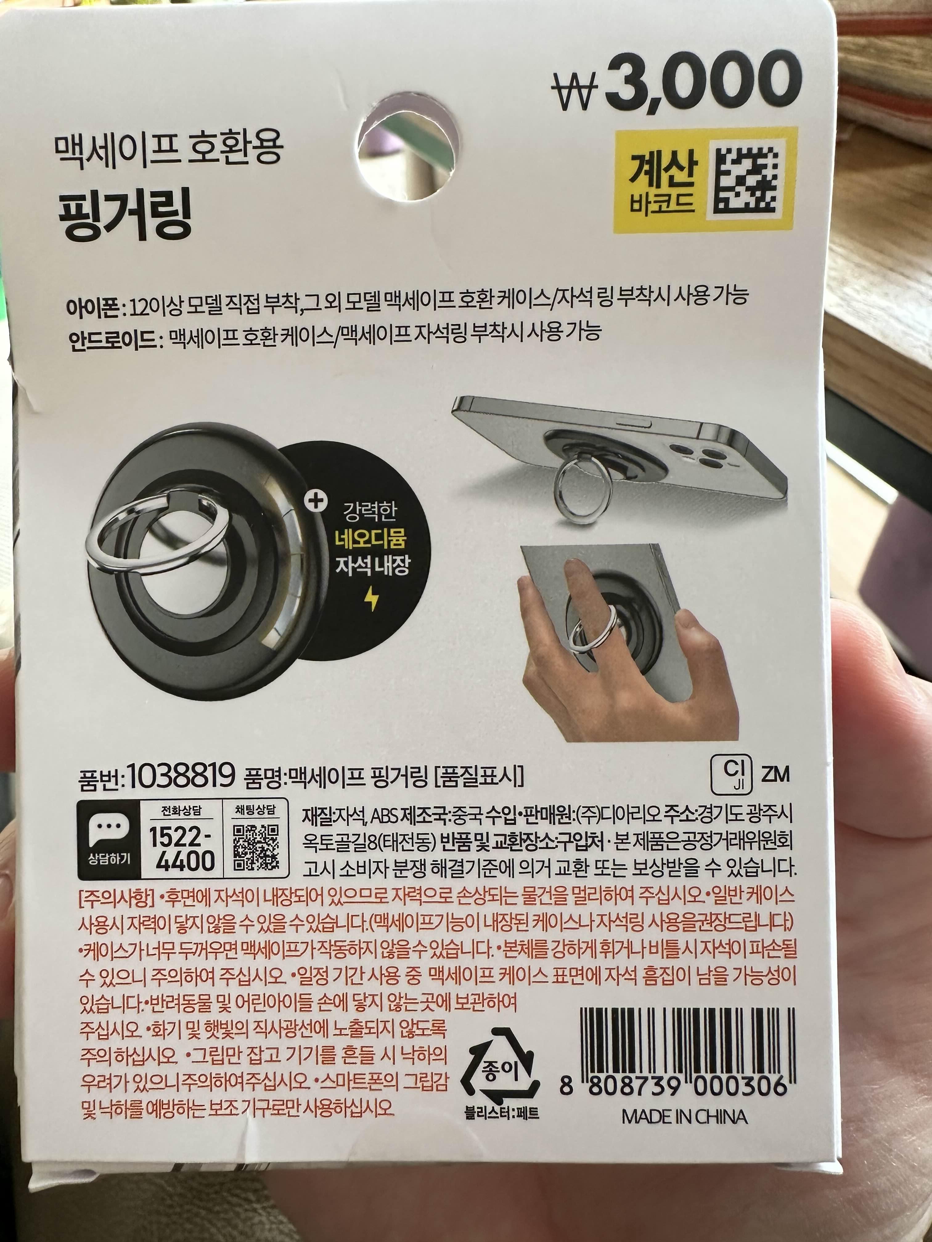 다이소에서 이 링을 맥 세이프 핑거링 이름으로 팔고 있어서 사 봤다 가격은 3000 원이었다.
