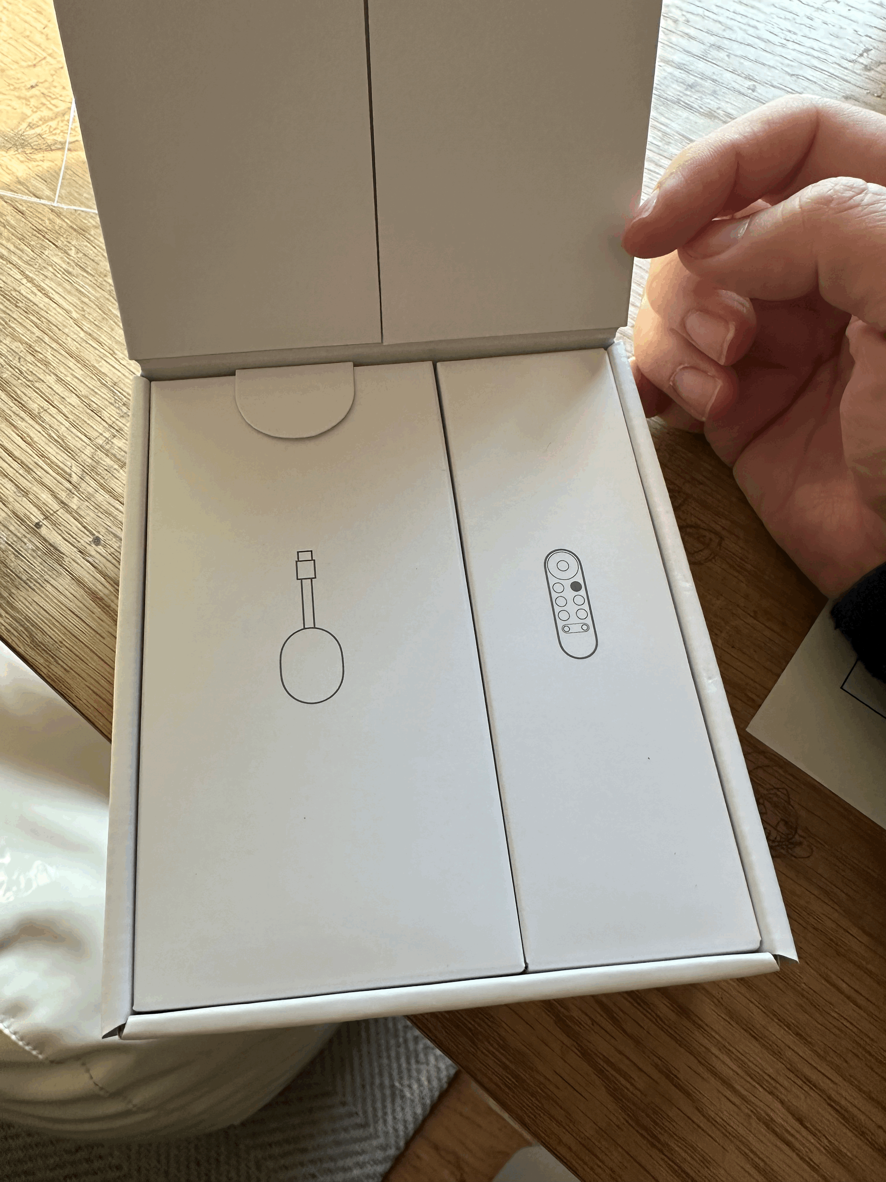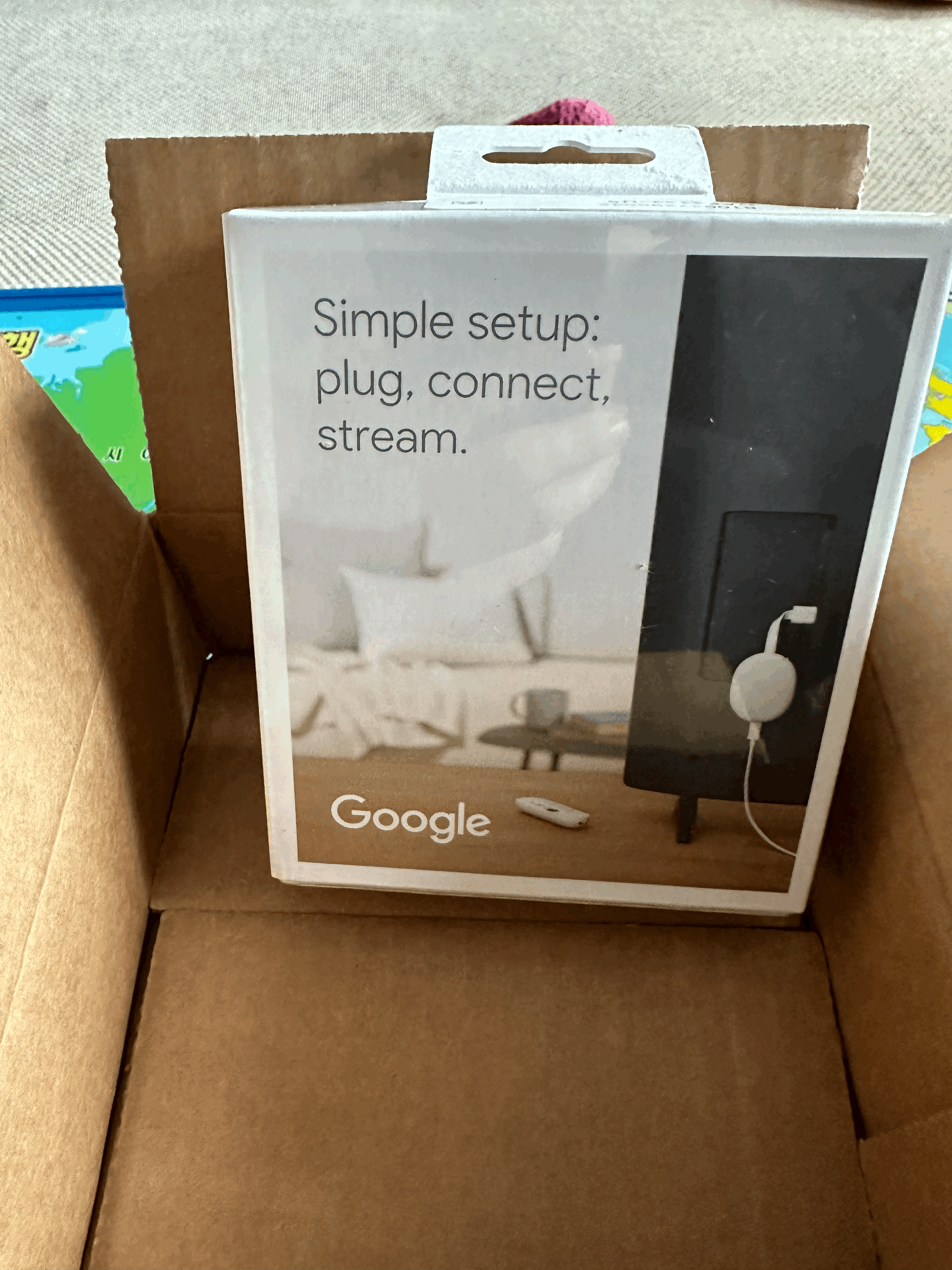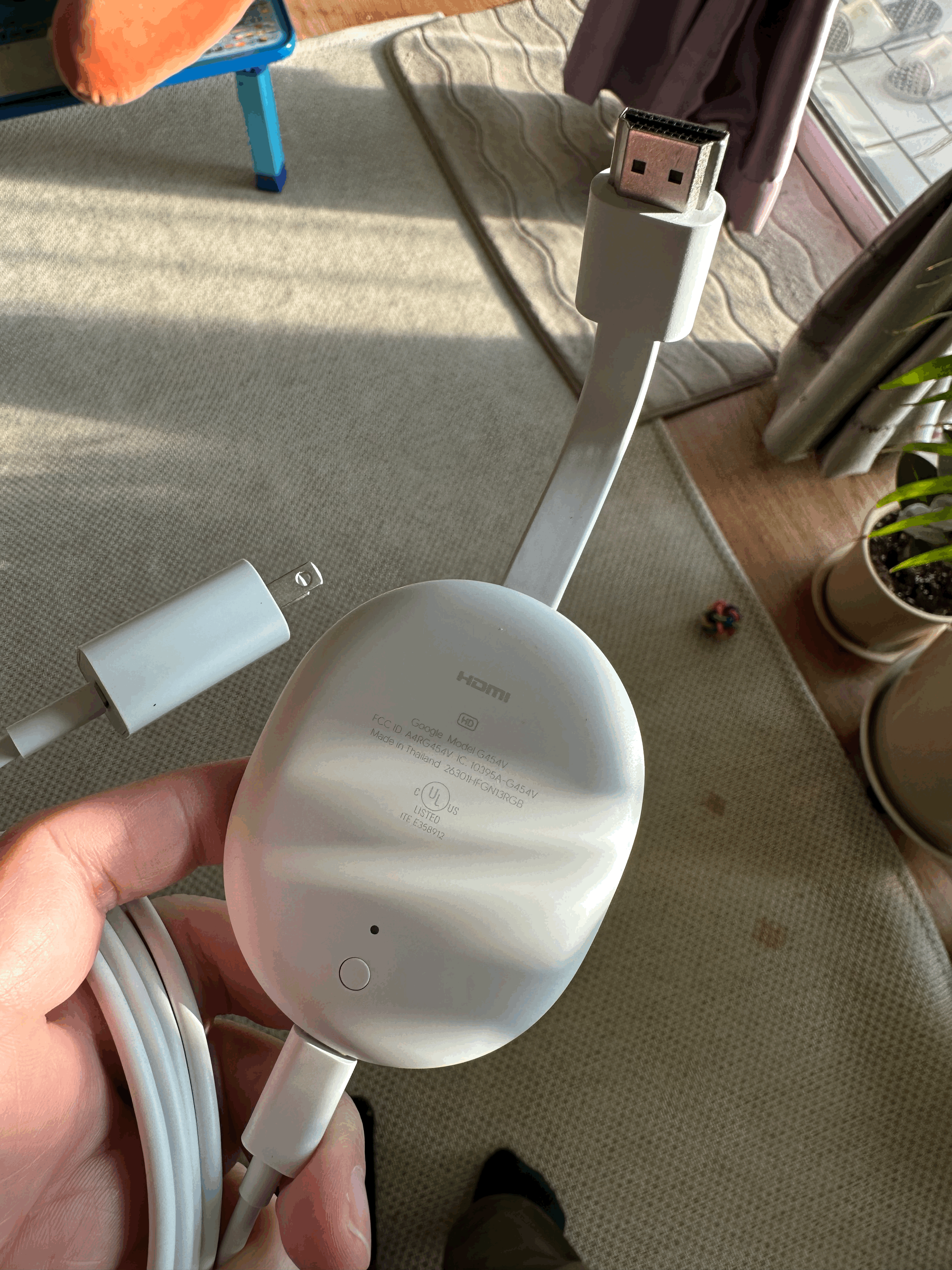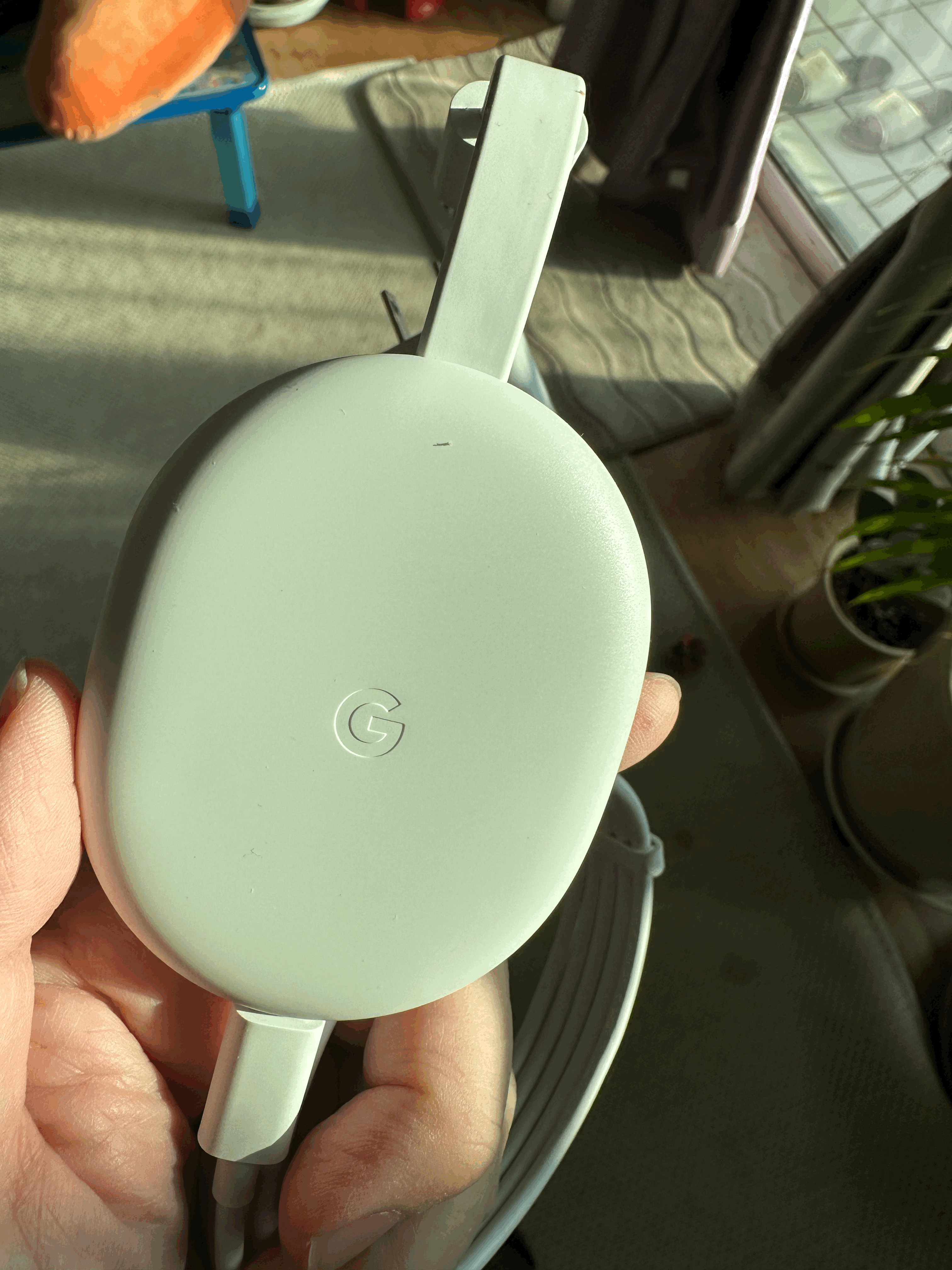자 그렇게 해서 아래와 같이 집으로 새로운 크롬캐스트가 딱 도착 이게 색상이 몇가지 있고 달걀처럼 디자인도 예쁜데, 사실 티비 뒤로 가는 경우가 많아서 굳이 디자인이 이렇게 예쁠 필요가 있나 싶다. 티비에 그냥 주렁주렁 매달아 놓고 써야 하는 제품이다. ㅎ