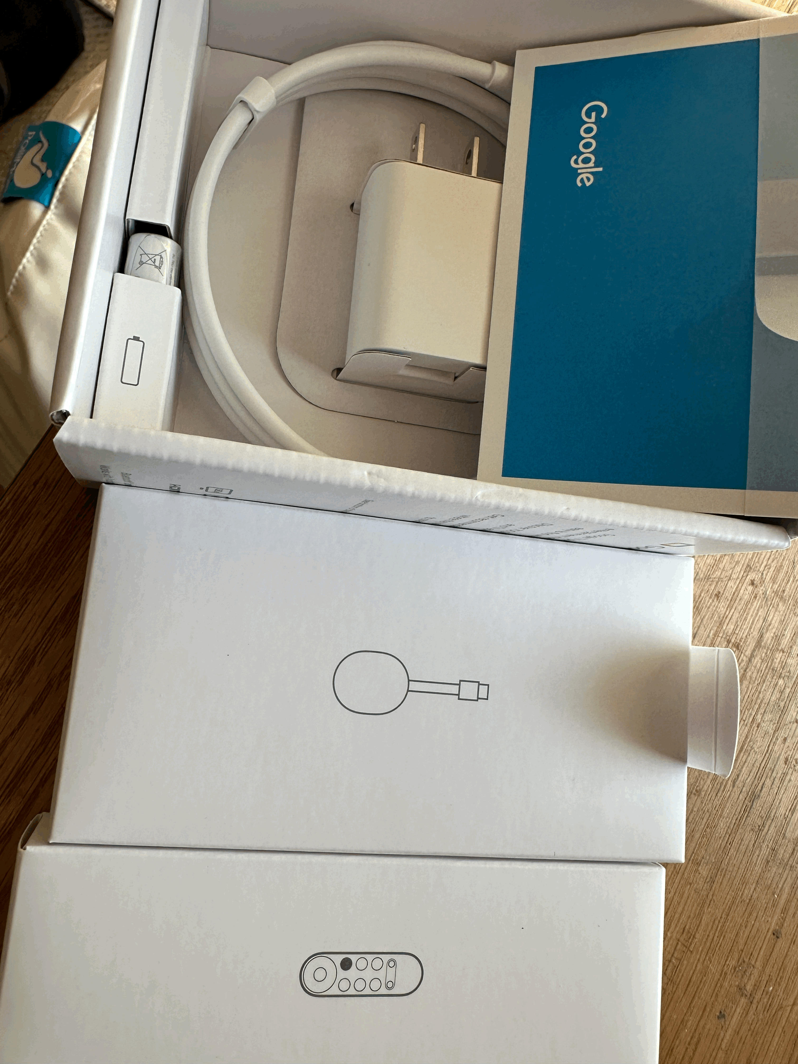그리고 간단한 설명서와 USB 충전케이블 그리고 충전기 (미국에서 구매해서 110 볼트인데 기존에 아이폰 등에서 사용하는 200V 충전기를 그대로 써도 된다.) 그리고 반대쪽 본체는 HDMI 선이 연결되어 있다. 참고로 충전기의 반대쪽이 흔한 USB 라는게 너무 좋다 USB C가 아니라. 리모콘용 배터리2개가 들어있다.