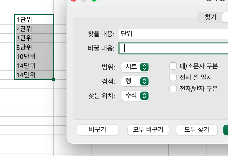 예를 들어 1단위 2단위 3단위 5단위 이렇게 써 있다고 하면... 단위 라는 단어를 찾는 단어로 하고, 바꾸기 항목에 공백 (띄어쓰기)를 넣는다. 그렇게 하고 바꾸면 아래와 같이 바뀌어진다.
