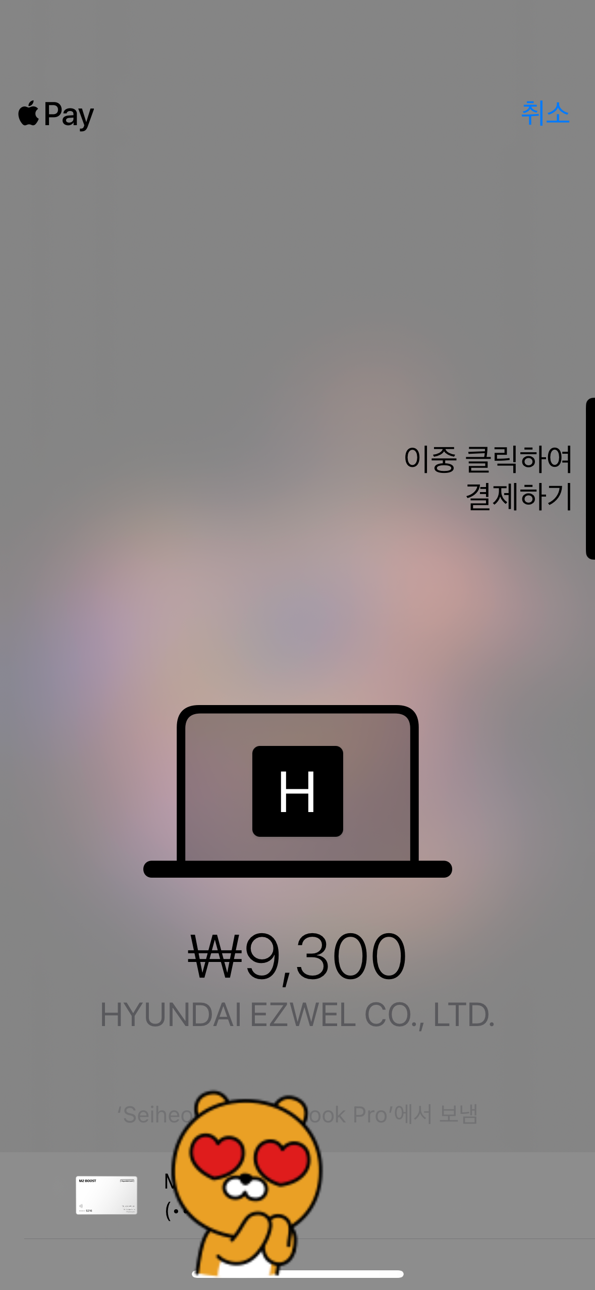 앗 그런데 맥북이 오래되었거나 맥미니 이거나 아이맥이거나 그러면 지문인식이나 얼굴 인식의 방법이 안되니까 이때 잠깐 아이폰이 필요하다. 그래서 아이폰쪽으로 결제하는 애플페이 화면이 뜬다. 그리고 아이폰쪽에서 얼굴인식을 시키면 온라인 결제 완료.