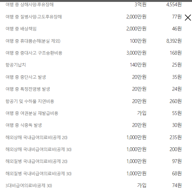 여행자 보험은 그야말로 보험이고, 사고 시 책임을 지는 부분이다. 그래도 아예 가입안하는게 찜찜하니까 보통 가입은 하는데, 1만원 이하 짜리도 많이 있다. 이번에 가입한 것은 2만원대 상품인데 '해외실손' 항목을 빼고 T 로밍 할인 쿠폰을 이용해했더니 1만원 가격으로 가입이 가능했다.