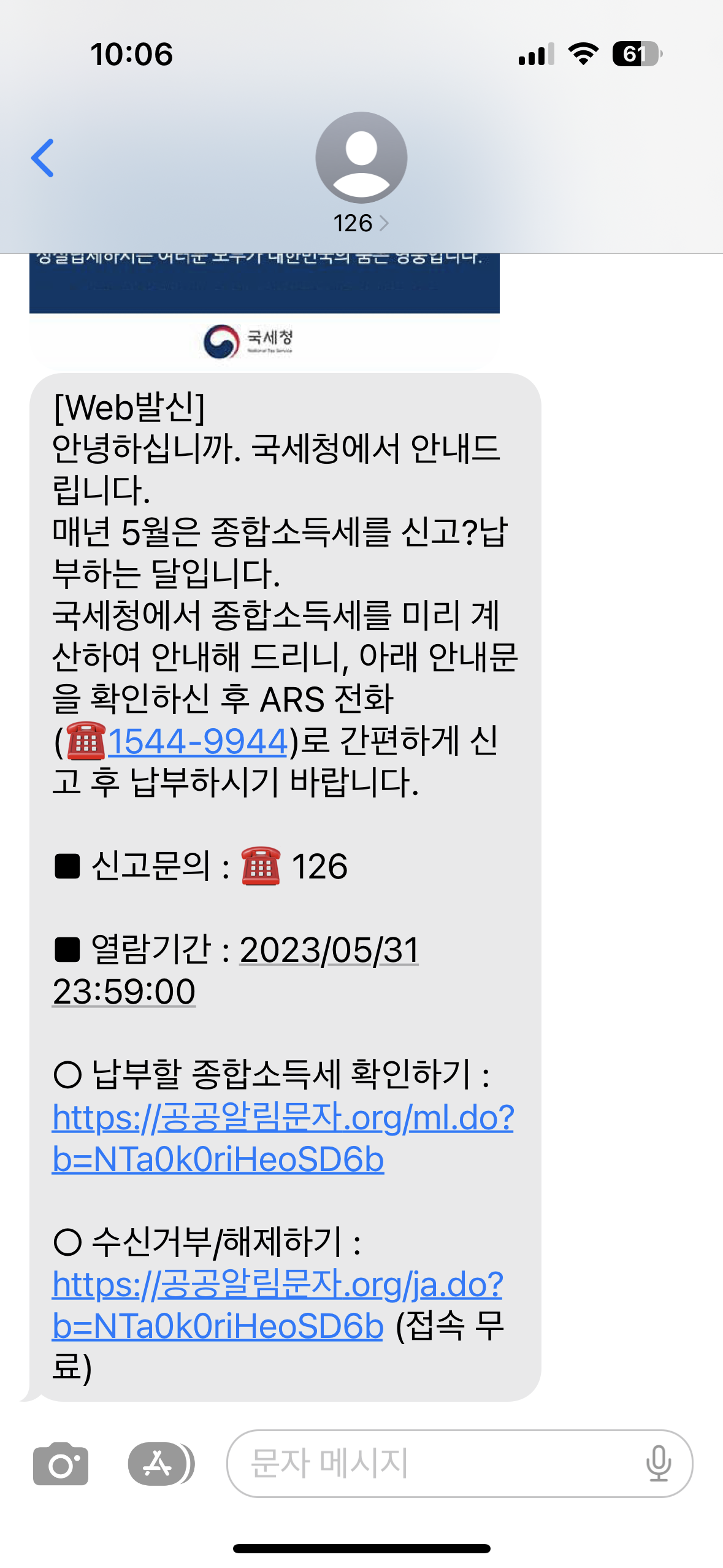 직장인들이라도 회사 이외의 다른 수입이 있거나, 직장인이 아니라 프리랜서라면 반드시 5월말까지 종합소득세를 신고해야한다. 자신이 벌어들인 수입 전체를 다 탈탈털고 들어간 비용은 계산해서 운이 좋으면 세금을 돌려받거나 운이 나쁘면 더 내야 하는 신고 기간이다. 이를 위해 4월말에 신고대상자들에게 국세청이 문자를 보내w준다 (아래 화면은 2023년 4월말에 온 내용이다) 보이스피싱이나 스팸일까봐 조심스럽게 확인했더니 국세청 맞다. 오 다행이다.. 역시 돈 받아가는 일은 잘하는 국세청인가 싶었다.